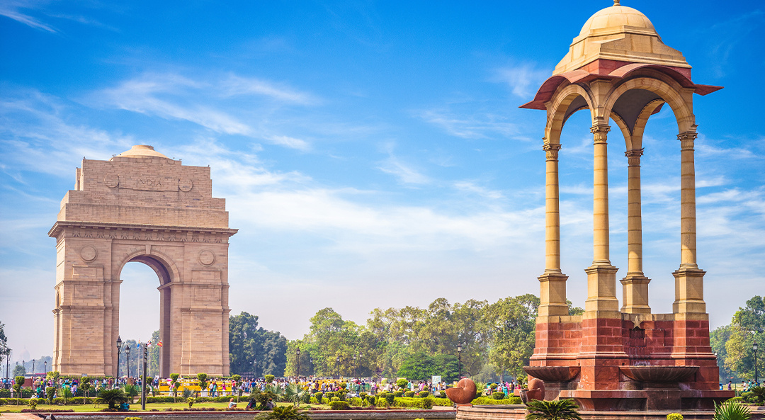 ">India kapunál, mely a háborúk mártírjainak emlékműve, és az UNESCO Világörökség része. Mahatma Gandhi fekete márvány emlékműve egy nagy zöld területen található. Megnézzük a Jama Masjid mecsetet, és a szintén Világörökség részét képező