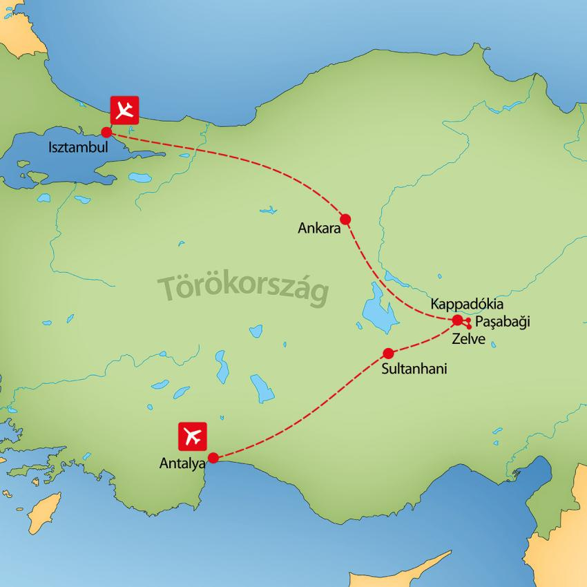 Vegyen részt páratlanul gazdag, ezerszínű körutazásunkon! Fedezze fel Isztambult, a Kelet és Nyugat kapuját, a Boszporusz elképesztő nagyvárosát, ismerje meg a köztársaság jelképét, a fővárost, a büszke Ankarát, a semmihez sem fogható Kappadókiát, a tündérkémények misztikus mesebirodalmát, és a Török Riviéra gyöngyszemét, a csodaszép Antalya-t. 1. nap: Érkezés Törökországba Repülés Budapestről Törökországba, Isztambulba átszállással. Kollégánk a repülőtéren fogadja, majd a szállodában frissítő welcome drinkkel üdvözli Önöket. Munkatársunk minden tudnivalót megoszt Önnel az előttünk álló héttel kapcsolatban. Két éjszakára szállás Isztambul környékén. 2. nap: Hippodrom – Kék Mecset – Topkapi Palota – fakultatív Boszporusz – Egyiptomi bazár Isztambulban, a Boszporusz büszke nagyvárosában, a Selyemút egykori utolsó állomásánál elbűvölő módon keveredik a keleti mesék és a mai kor világa. Sziluettjét titokzatos minaretek, a Boszporuszon átívelő függőhíd, az Aranyszarv-öböl opálos víztükrén úszó hajók határozzák meg. A reggeli után az egykori Hippodromhoz látogatunk el, mely gyülekezési helyként szolgált. Itt megtekintünk három ókori emléket. Emellett belépünk a káprázatos Kék Mecsetbe, melyet az iszlám világ kiemelkedő szent helyeként tartanak számon. Felkeressük a Topkapi palotát, mely évszázados méltóságában a Szeráj-csúcsról tekint le, az Aranyszarv-öböl, és a Márvány-tenger között. Falai között szultánok éltek. A szeráj ma is az egykori oszmán birodalom erejét sugározza, és kincseit őrzi. Délután fakultatív program: varázslatos hajóút a Boszporuszon. Ne szalassza el az alkalmat, hogy az izgalmas hajós kaland során mesés képek elevenedjenek meg Ön előtt! Ősidők óta a gazdagok és hatalmasok privilégiuma volt Ázsia édesvizein utazni. A két part, Európa és Ázsia között között szeli hajónk a hullámokat, míg csodálattal adózhatunk a múlt és jelen megkapó, harmonikus együtt létezésének, a ragyogás és a letisztult szépség kontrasztjának. A távolban számos festői homlokzat, impozáns erőd, mesés palota körvonalai rajzolódnak ki. Meglátogatjuk az Egyiptomi bazárt (Fűszerpiac), ahol elbűvölnek minket a keleti színek és illatok. Visszatérés a hotelbe. 3. nap: Ankara – Anatóliai Civilizációk Múzeuma – Atatürk Mauzóleum külső megtekintése A reggeli után kijelentkezés a hotelből, majd ezt követően Törökország fővárosába, a mintegy 5,5 millió főnyi népességű Ankarába utazunk. A függetlenségi háború után Ankara vált az újonnan megalakuló köztársaság és a modern Törökország jelképévé. Felkeressük az Anatóliai Civilizációk Múzeumát, melyben páratlan régészeti kincseket tekinthetünk meg. Következő állomásunk a Mustafa Kemal Atatürk Mauzóleum külső megtekintése egy fotó szünet erejéig, mely az államalapító előtt tiszteleg, és egyúttal a város szimbólumaként is ismert. Szállás Ankara környékén. 4. nap: Kappadókia: Paşabağı és Zelve Kijelentkezés a hotelből. Utazás Kappadókia felé. Paşabağı, vagy másnéven a Szerzetesek Völgye az első állomásunk, ahol a tündérkémények elképesztő látványa fogad minket. Ezeket az egyedülálló formációkat a víz és a szél ereje alakította ki, és misztikus alakzatokként emelkednek ki a földből. Tegyen egy sétát ebben az elvarázsolt mesebirodalomban, és csodálja meg a kövekbe vésett részleteket, melyeket a természet művészi keze alkotott meg! Innen egy kőhajtásnyira található Zelve történelmi falucskája. Ez a szabadtéri múzeum betekintést enged a múltba, a tufasziklákba vájt vulkanikus barlanglakások, templomok, kolostorok egy bámulatos világot tárnak fel előttünk.Majd lehetőség nyílik egy helyi szőnyeg bolt megtekintésére. Fedezze fel a sziklák között labirintust formáló utakat, csodálja meg a kövekbe vésett formákat! Szállás Kappadókiában. 5. nap: Tündérkémények és fenséges völgyek, majd szabadidő vagy fakultatív Kappadókia a világ egyik legizgalmasabb, leglélegzetelállítóbb tája, melynek egyedülálló képződményei a különböző méretű és formájú Tündérkémények, a különleges sziklaformációk, melyeket évezredekkel ezelőtt a vulkanikus tevékenység és erózió formált meg. Kappadókia területét festői völgyek ékesítik. A Képzelet Völgye olyan, mintha egy álomvilágba csöppennénk, a számos tündérkéménnyel, melyek közül sok állatokra emlékeztet. Egy fantasztikus helyszín a Üç Güzeller, azaz Három Szépség-völgy, ahol három sziklaalakzat uralja a tájat. A Güvercinlik, azaz Galamb-völgy nevét onnan kapta, hogy itt a tufába többezer galambodút vájtak. A nap első felében ezeket a csodákat keressük fel. Majd szabadidő vár Önre vagy tartson velünk félnapos fakultatív kirándulásra. Szállás Kappadókiában. 6. nap: Sultanhani – Antalya Reggeli a szállodában, majd kijelentkezés a hotelből. Elhagyjuk Kappadókia varázslatos-időtlen világát és Sultanhaniba, a híres szeldzsuk karaván menedékhez megyünk, ahol a múlt titkai tárulnak fel előttünk. Ezt követően a festői tájat teljes mértékben meghatározó, csodálatos Taurus-hegységen keresztül visszatérünk Antalya környékére, ahol az utolsó két éjszakát töltjük. Szállás Antalya környékén. 7. nap: Antalya – Karpuzkaldiran-vízesés Körutazásunk végén Antalyába látogatunk, amely a Török Riviéra egyik legszebb városa. Az országba látogatók népszerűségi listáján előkelő helyet foglal el, évente több millió turista keresi fel. A Taurus-hegység gyönyörű csúcsai és a régióra jellemző buja növényzet csodálatos látványt nyújtanak. Megnézzük a város szimbólumait, többek között a „rovát