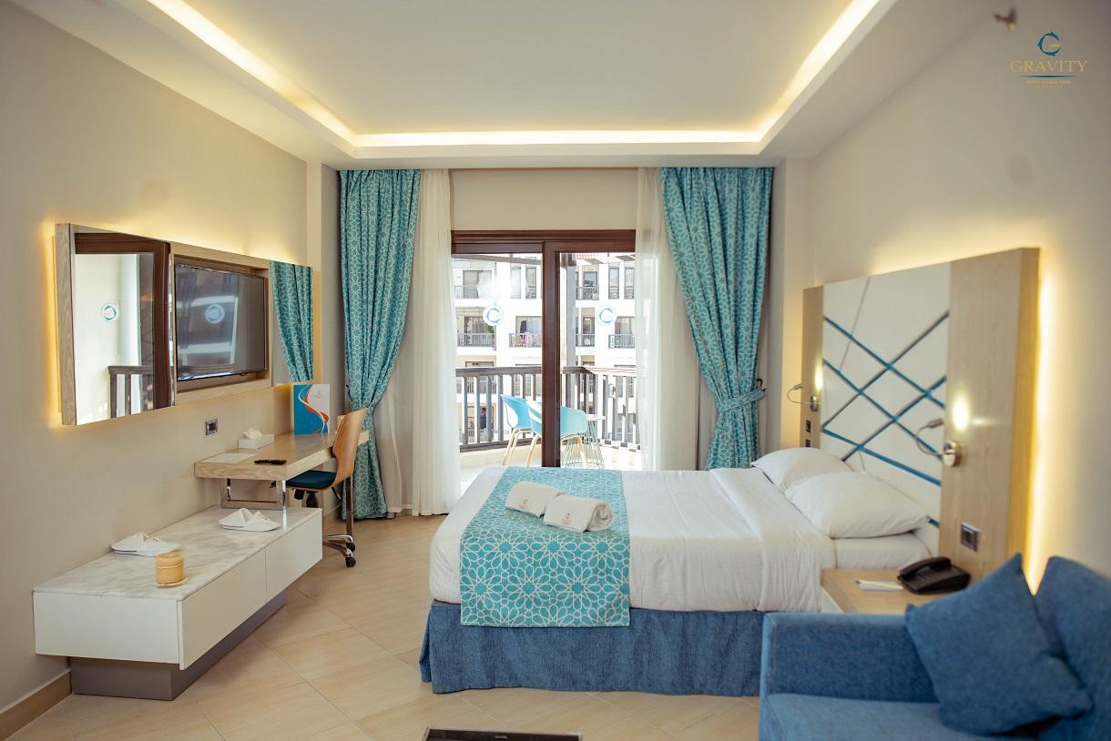 Szobák: A Gravity Hotel & Aqua Park Hurghada összesen 350 szobával rendelkezik. A szobákban, légkondicionáló, televízió, telefon, minibár, tea- és kávékészítéshez szükséges eszközök, széf, WiFi csatlakozási lehetőség található. A fürdőszobák hajszárítóval vannak felszerelve. A szobák egy részéhez erkély vagy terasz tartozik.
