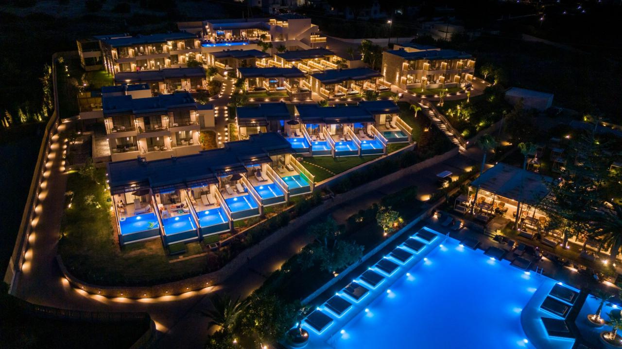 Az épületegyüttes amfiteátrálisan emelkedik a zöldellő domboldalon, ahonnan akadálytalan kilátás nyílik a tengerre. A főépületben kaptak helyet a classic szobák és lakosztályok, míg a színes kertben szétszórva számos bungaló található saját medencével vagy kültéri jacuzzival.