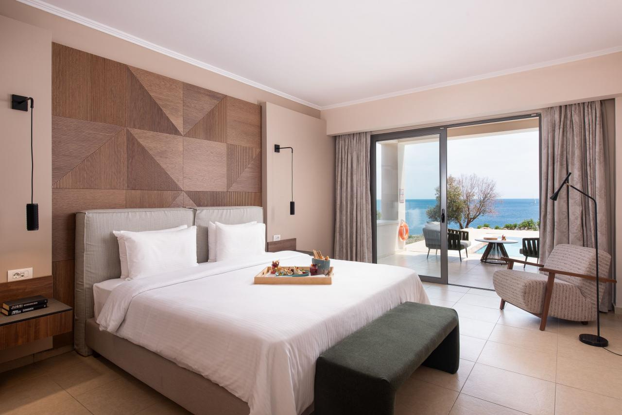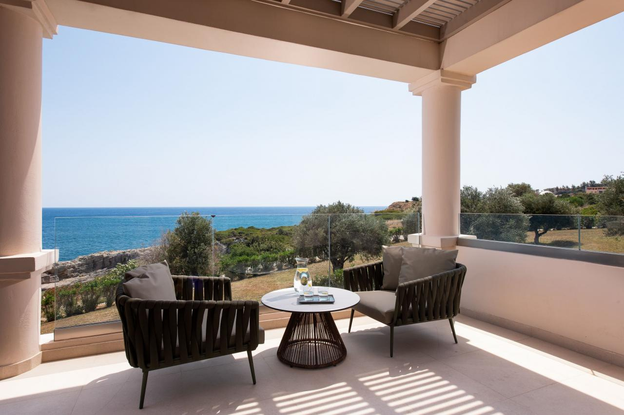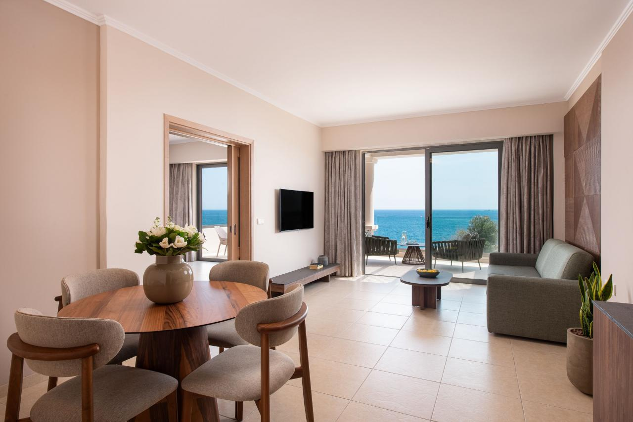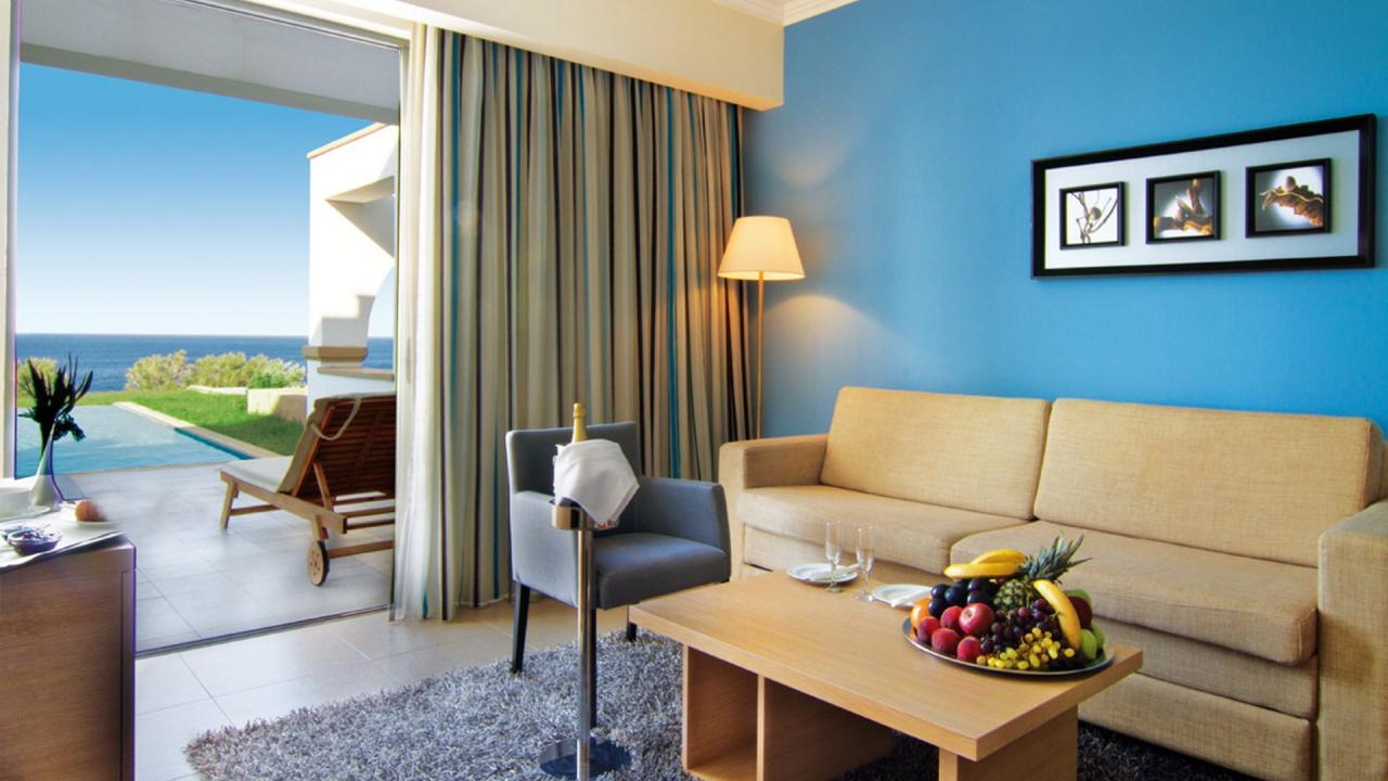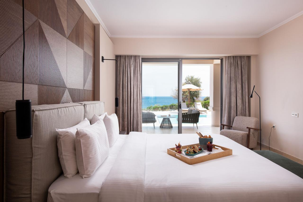 Privát medencés junior lakosztály („Junior Suite Sea View Private Pool”): 52 m2, egy légterű, saját medence napozóágyakkal, tengerre néző szoba