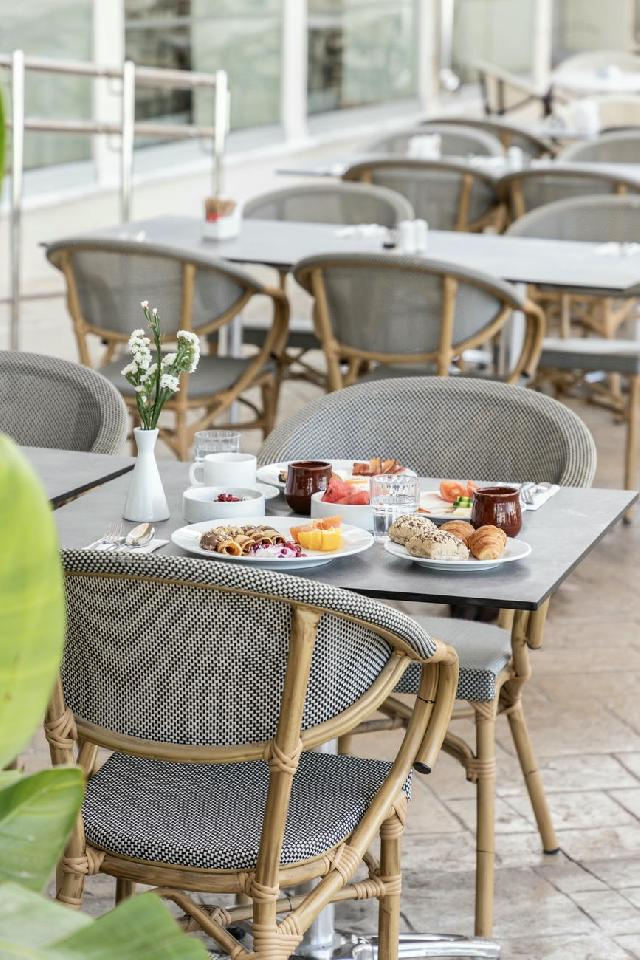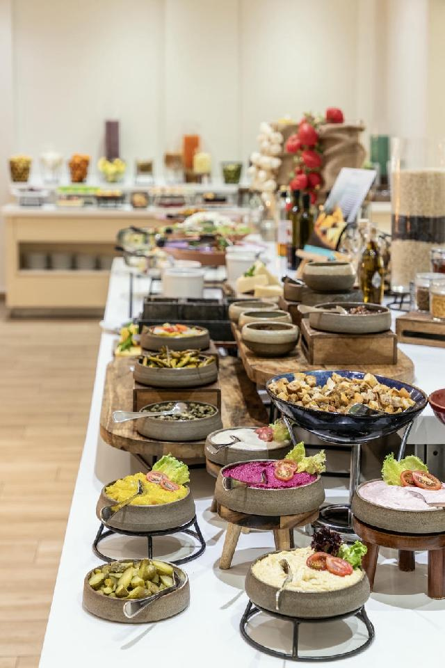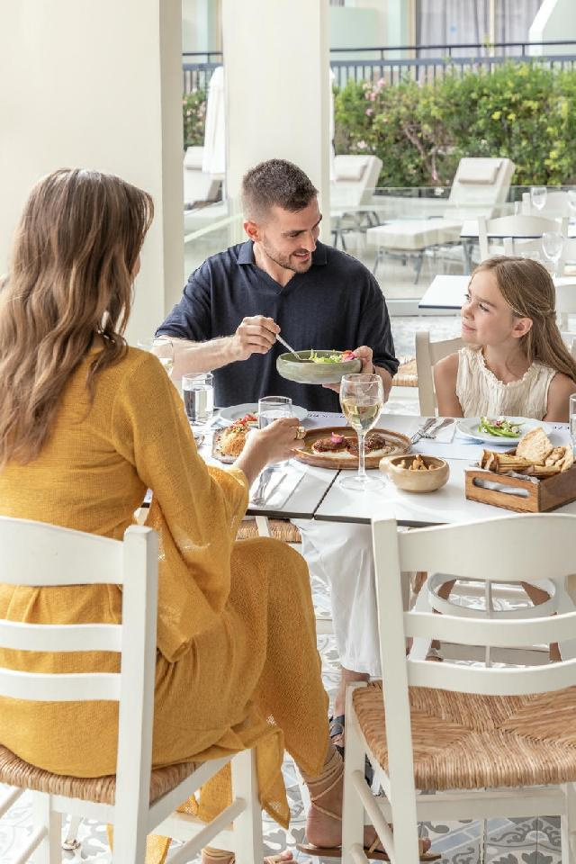 Étkezés: prémium all inclusive ellátás. Tartalmazza: svédasztalos reggeli (07.00-10.00), ebéd (12.30-15.00) és vacsora (18.30-21.30), a főétkezések között büfésarok snack ételekkel, délutáni kávé és sütemény, helyi jégkrémek, korlátlan italfogyasztás 10–24 óra között: a szálloda által megjelölt helyi és nemzetközi röviditalok széles választéka, koktélok, sörök, borok, gyümölcslé, szénsavas üdítőitalok, ásványvíz, kávé, tea. Térítésmentes átfoglalási lehetőség a görög étterembe (1 alkalommal). Ebédcsomag készítése (amennyiben a napot nem a szállodában töltik), mely szendvicseket, gyümölcsöt, édességet, ásványvizet és gyümölcslét tartalmaz (24 órával korábban a recepción kell igényelni).