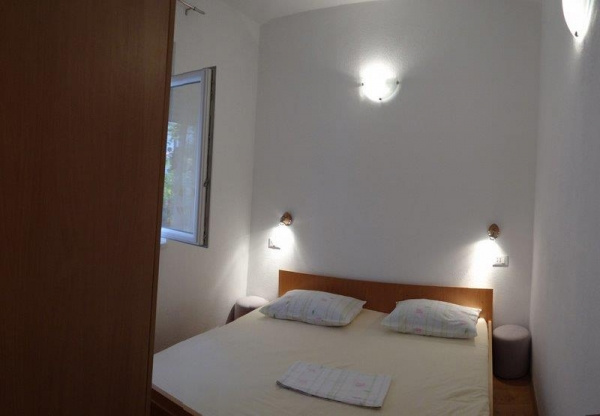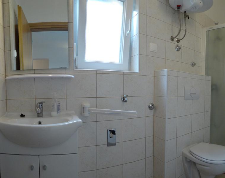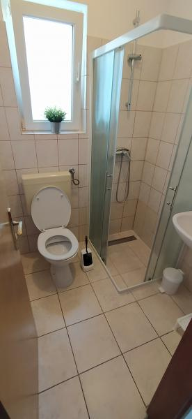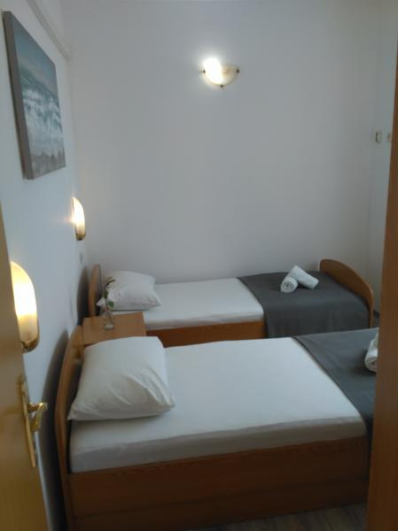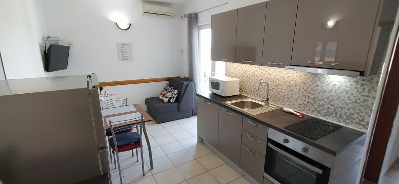 D2+1+1 ágyas: 40 nm/1 db 1. emeleti (kétágyas hálószoba, nappali kihúzható ággyal /1 felnőtt, vagy 2 gyermek (6 évig) részére/, konyhasarok, mikró, klíma, TV, vízforraló, mosógatógép, fürdőszoba, tengerre néző erkély)