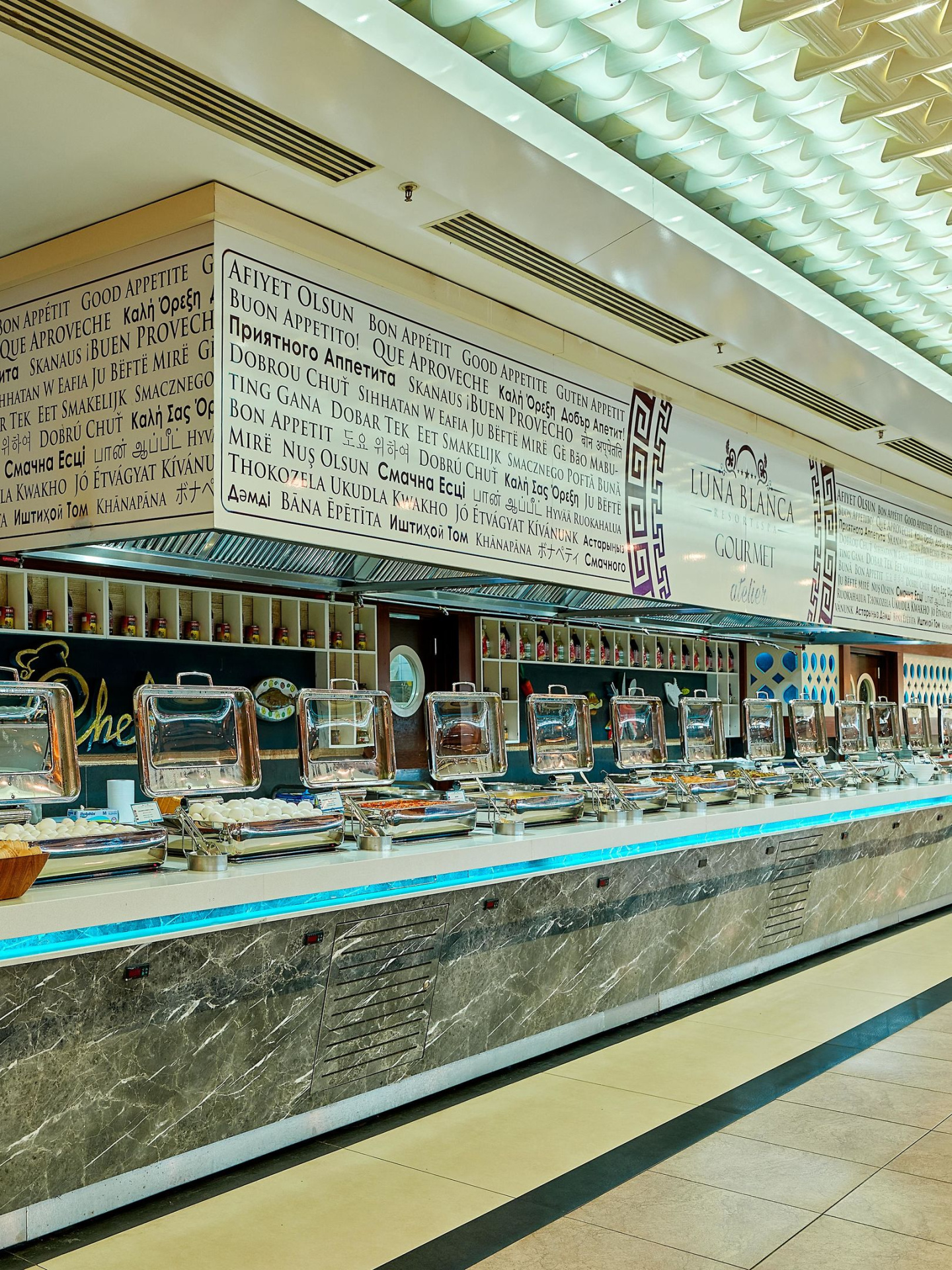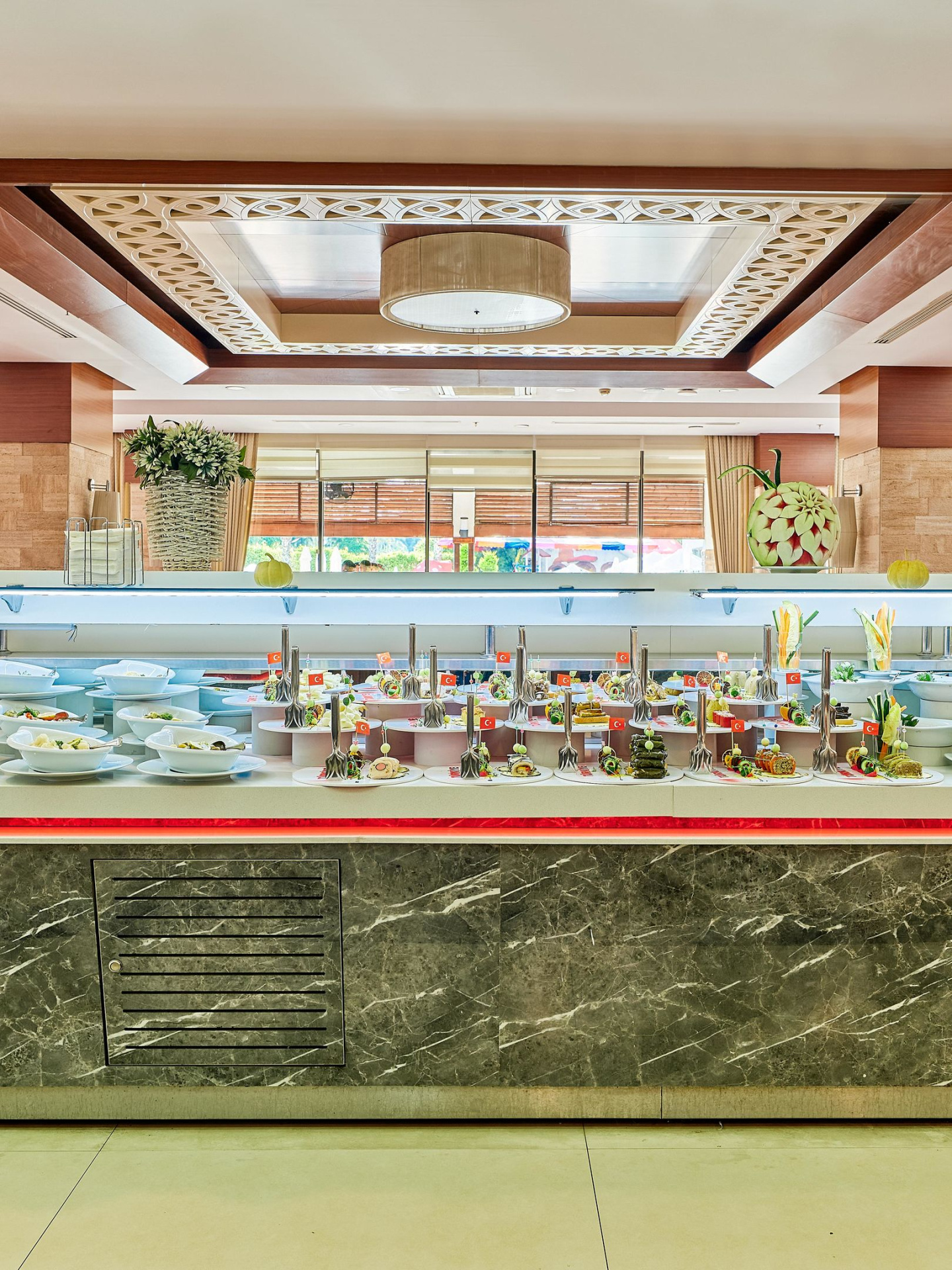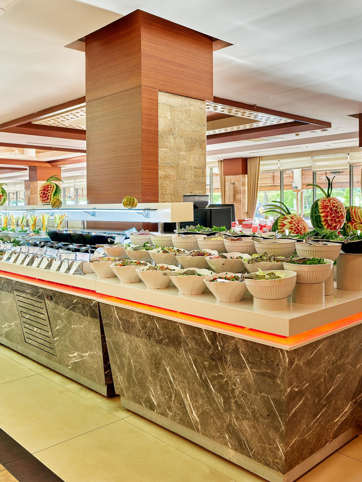 All inclusive ellátás. Ezen kívül reggeli, ebéd és vacsora külön is foglalható. Külön kérésre szívesen készítenek diétás ételeket, vegetáriánus ételeket és gyermekeknek szánt ételeket. Ezen kívül kapható speciális ételek és snackek. A kínálatban találhatók alkoholmentes italok és alkoholos italok.
