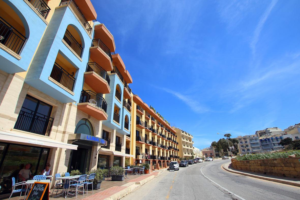 Fekvése: utasaink körében évek óta nagy népszerűségnek örvendő, több épületből álló 160 szobás modern, jól felszerelt apartmanhotel, egyedülálló fekvéssel, ideális helyen, a Mellieha Bay (Málta legnépszerűbb lassan mélyülő homokos strandja) közelében, a legközelebbi beach klubtól (fizetős) háromszáz, a homokos szabad strandtól ötszáz méterre található. Mellieha városa 1 km-re, egy kiugró sziklaszirten található. Közelében a kisvendéglők, bárok és buszmegálló található. A szállás közelében található buszmegállóból egyénileg is könnyen megközelíthetjük a sziget bármely pontját.