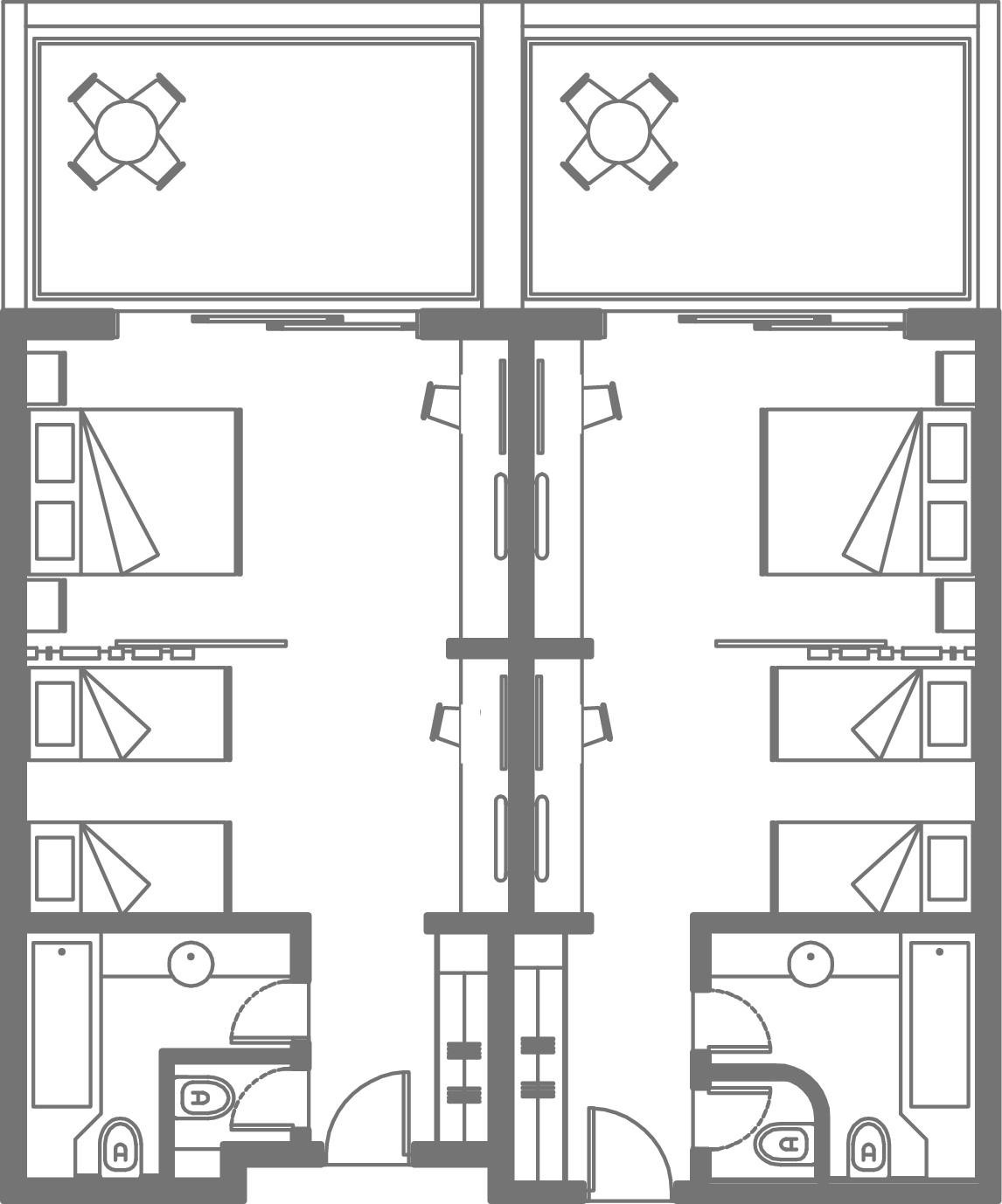 - családi szobák - 2 hálószoba ajtóval elválasztva, mikrohullámú sütő, 2 fürdőszoba, 2x TV, kertre vagy tájra nézők