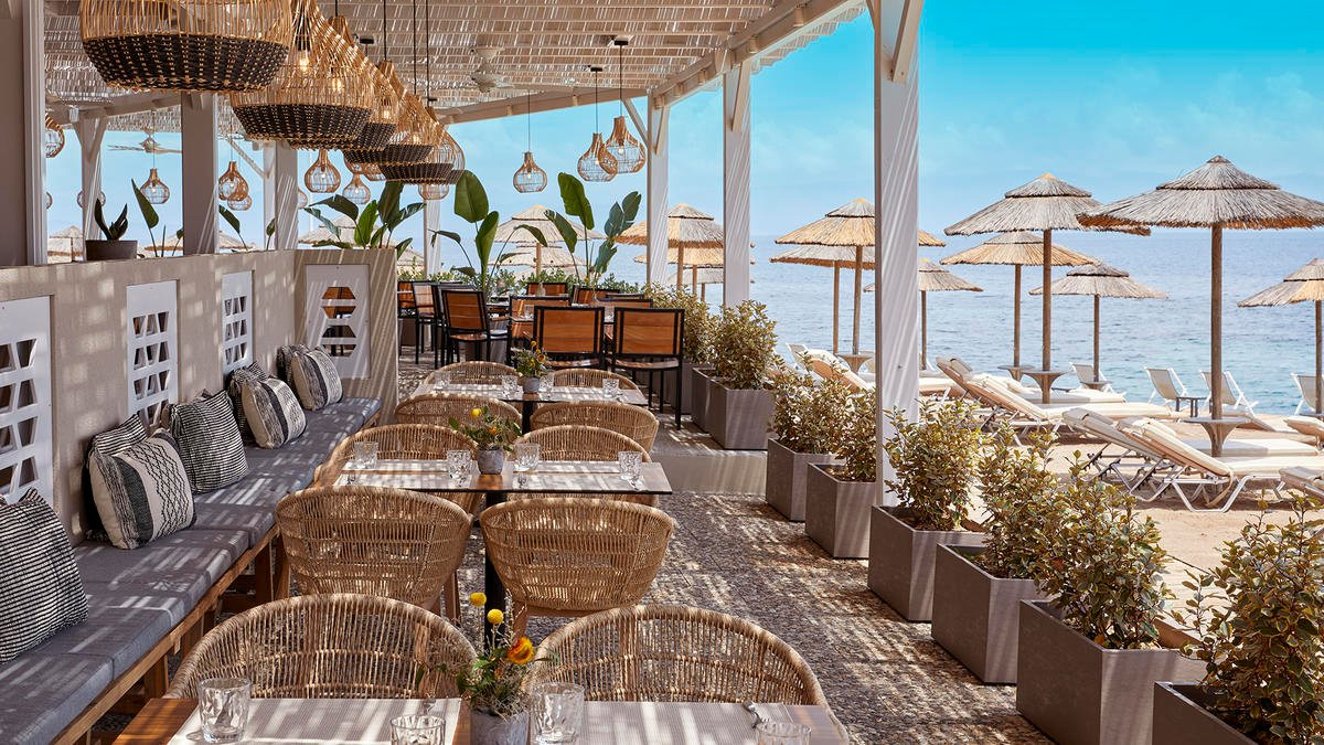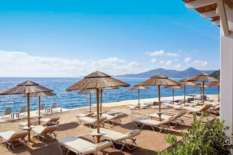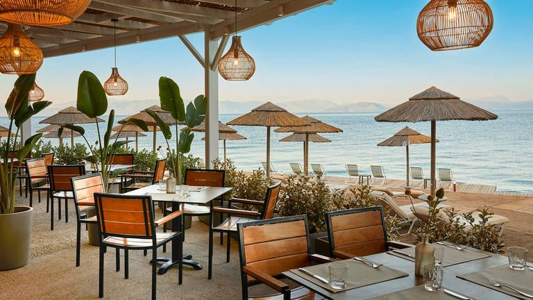 A homokos-kavicsos strand kb. 100 m található a szállodától épülettől függően, melyet a kerten illetve egy alagúton keresztül lehet megközelíteni. A strand egy részén stégről lehet létrán keresztül a tengerbe jutni. A strandon napágyak és napernyők ingyenesen állnak rendelkeztésre, öltözők és zuhanyzó is elérhető.