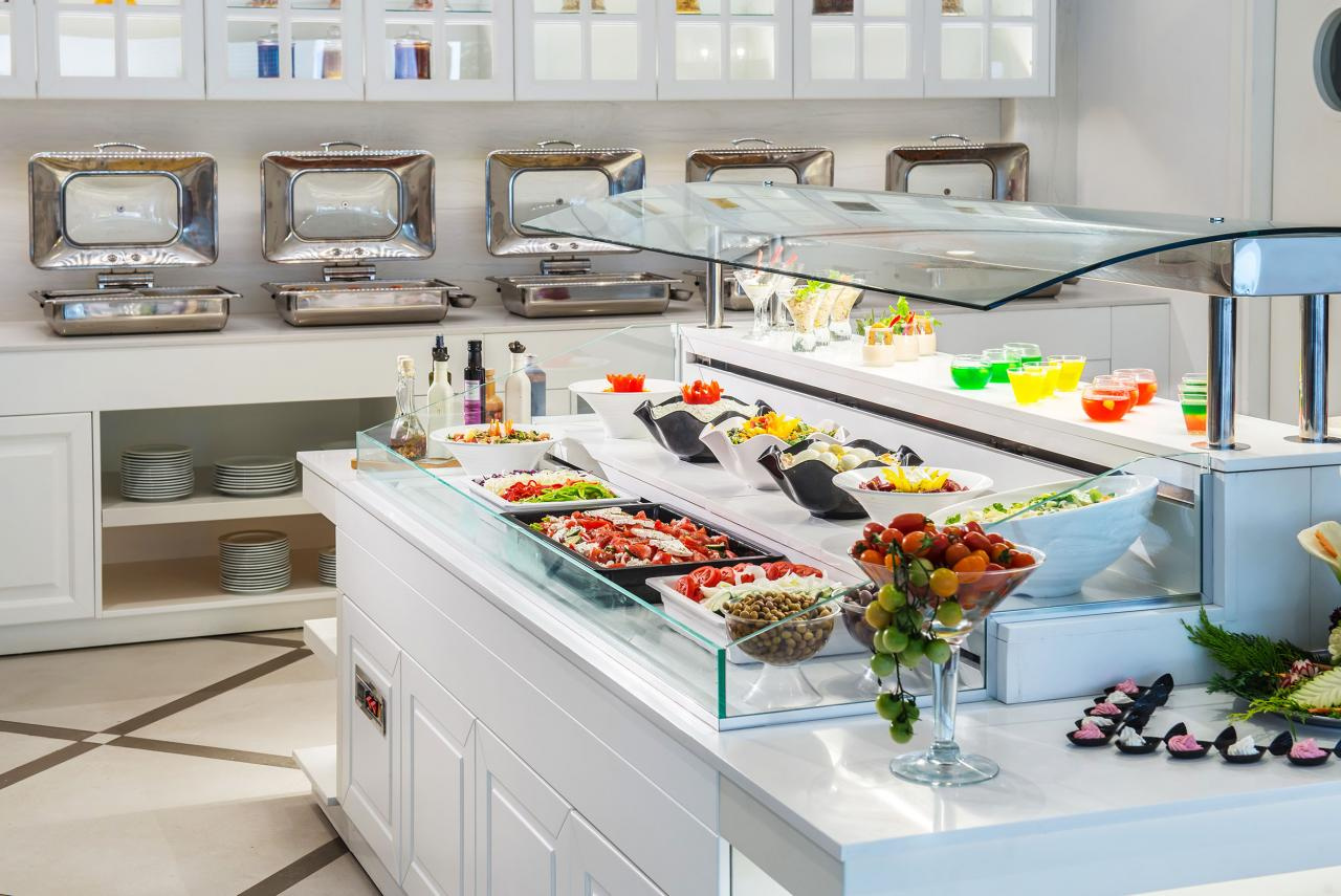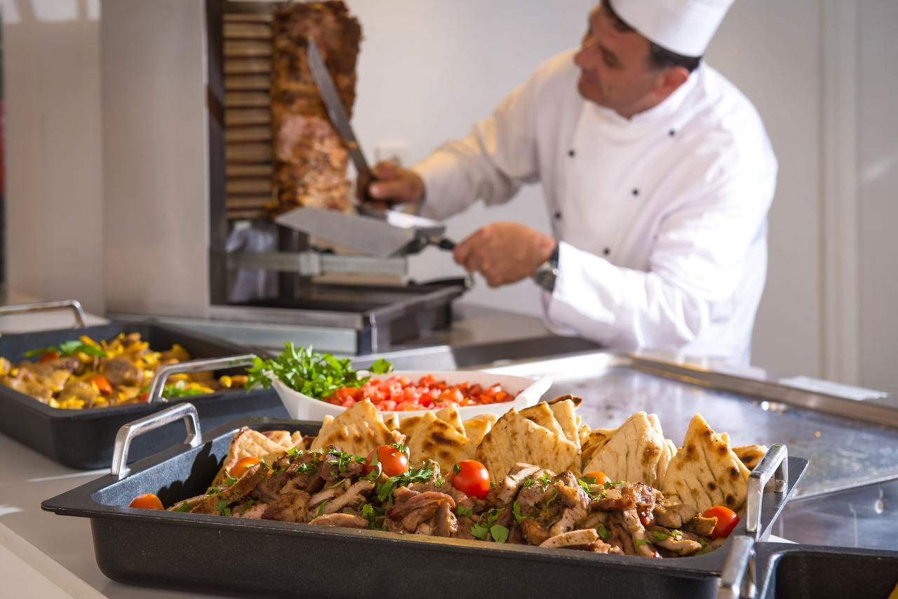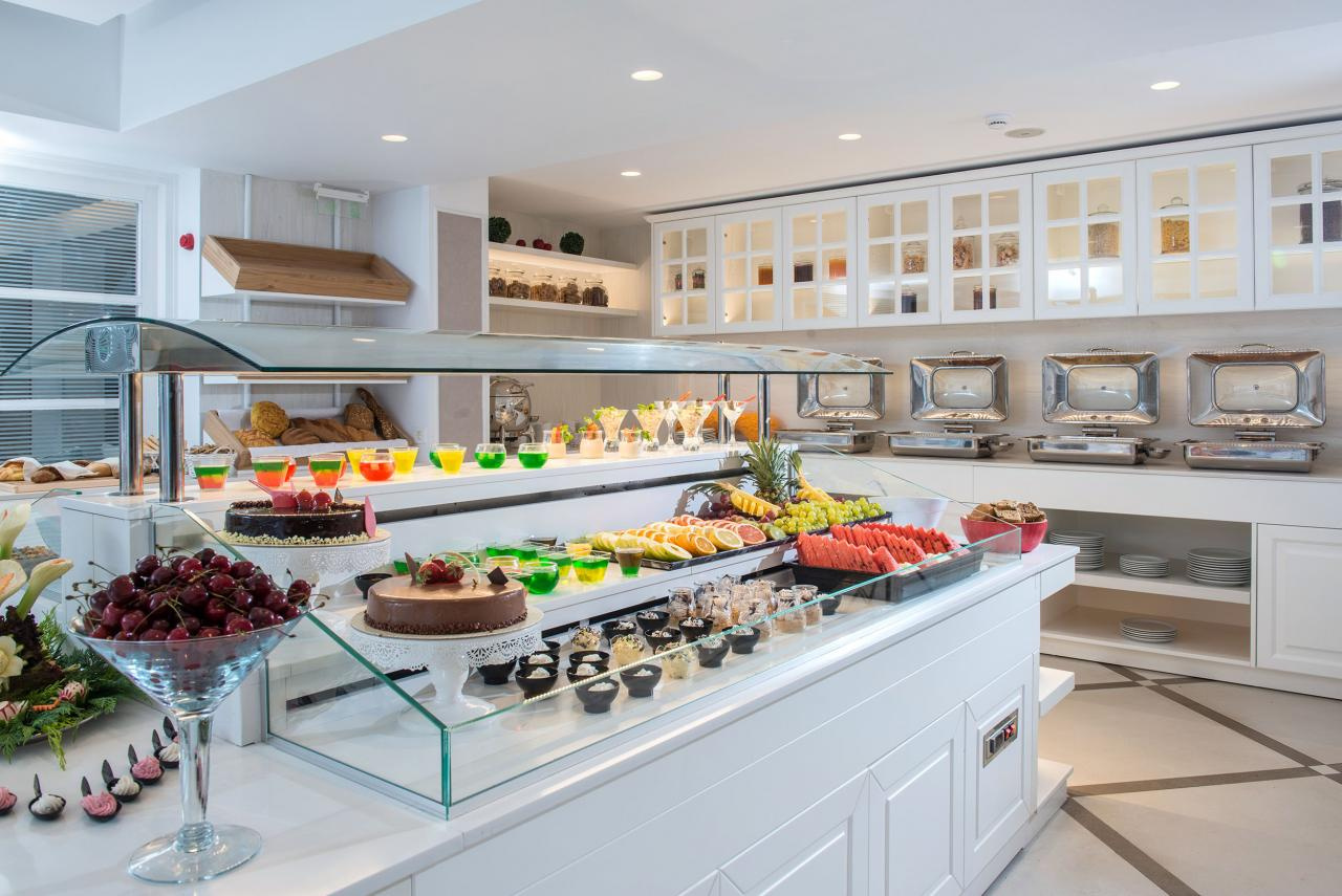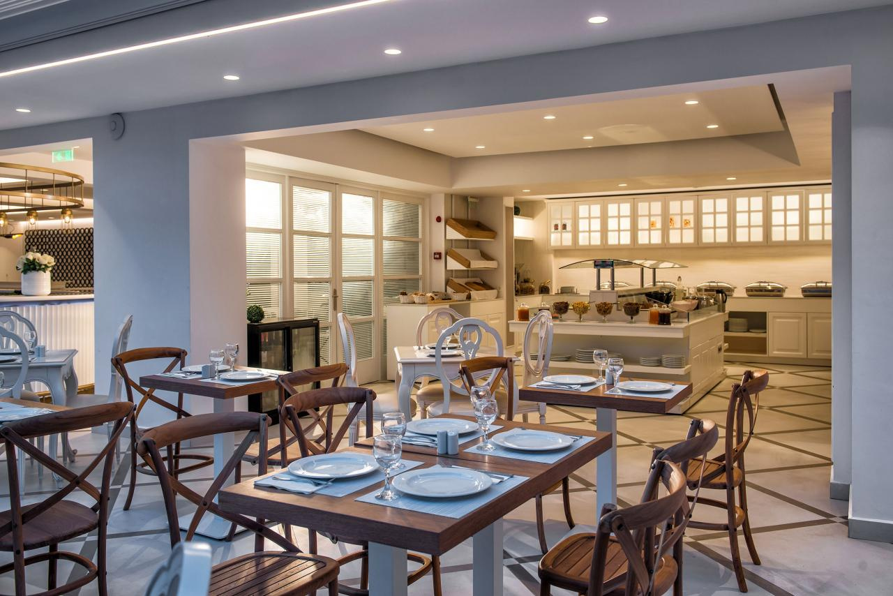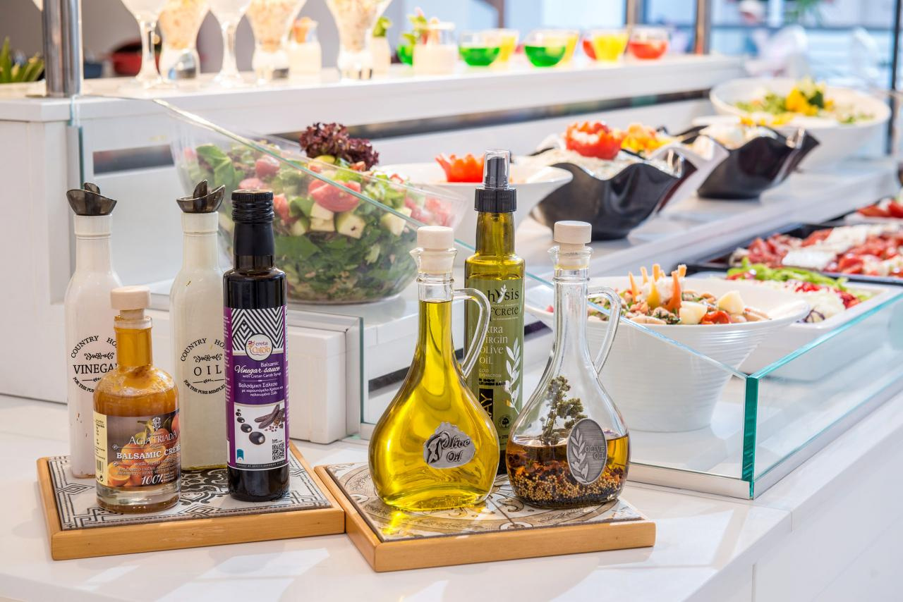 Félpanziós ellátással (reggeli és vacsora italok nélkül) foglalható. A szálloda étterme görög és mediterrán konyhával várja vendégeit. A szálloda egy bárral is rendelkezik a medence mellett.