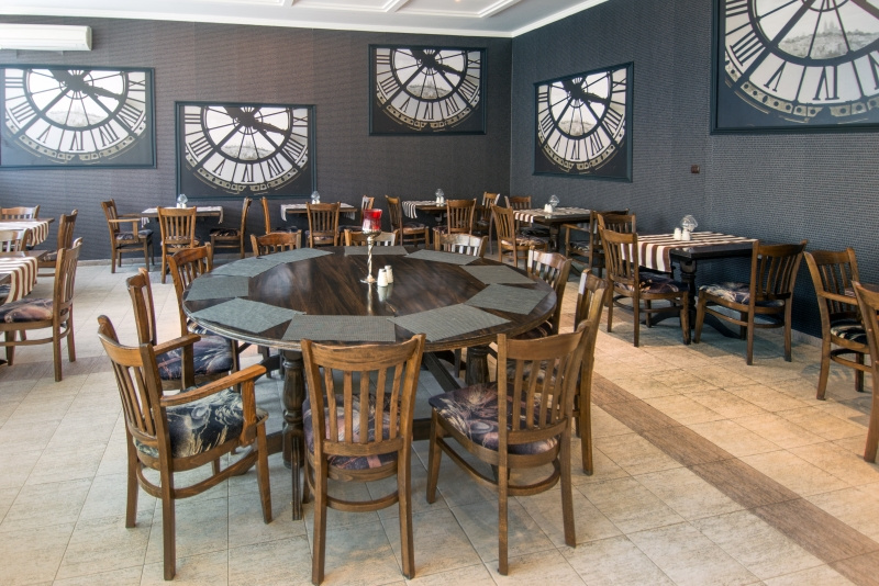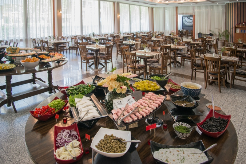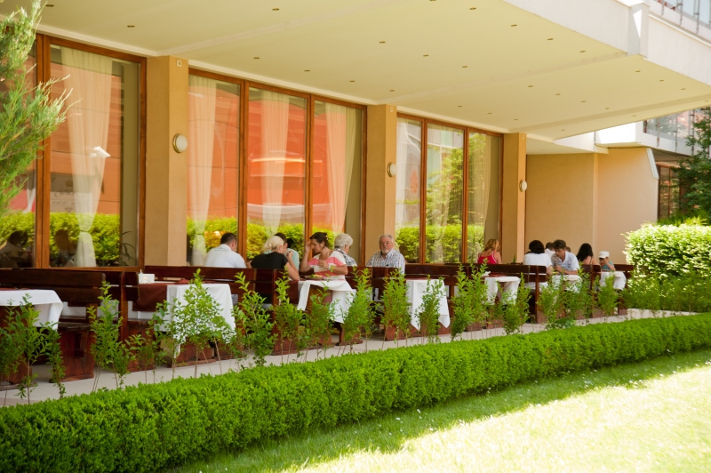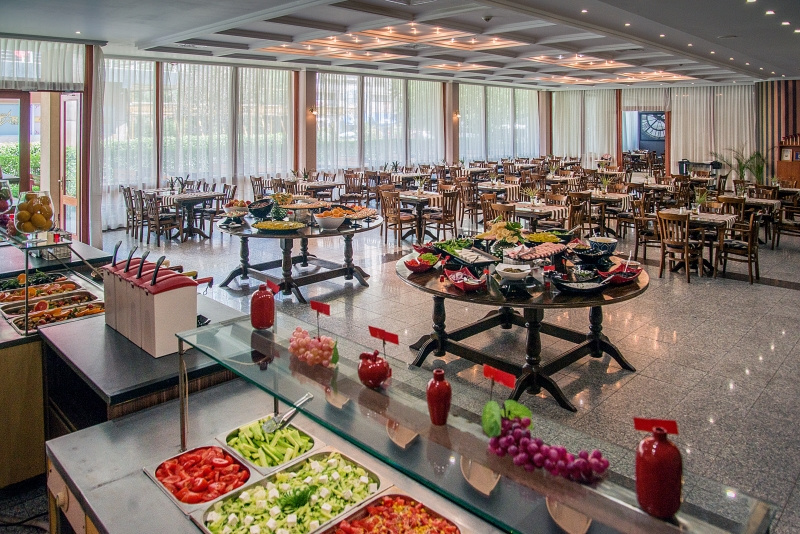Nemzetközi konyha, friss saláták és ételek széles választékával. Gazdag gyümölcs- és desszertválaszték. Üdítőitalok és alkoholos italok, sör és bor ( helyi termékek). Hetente egyszer - Hagyományos bolgár, olasz, vacsorák.
