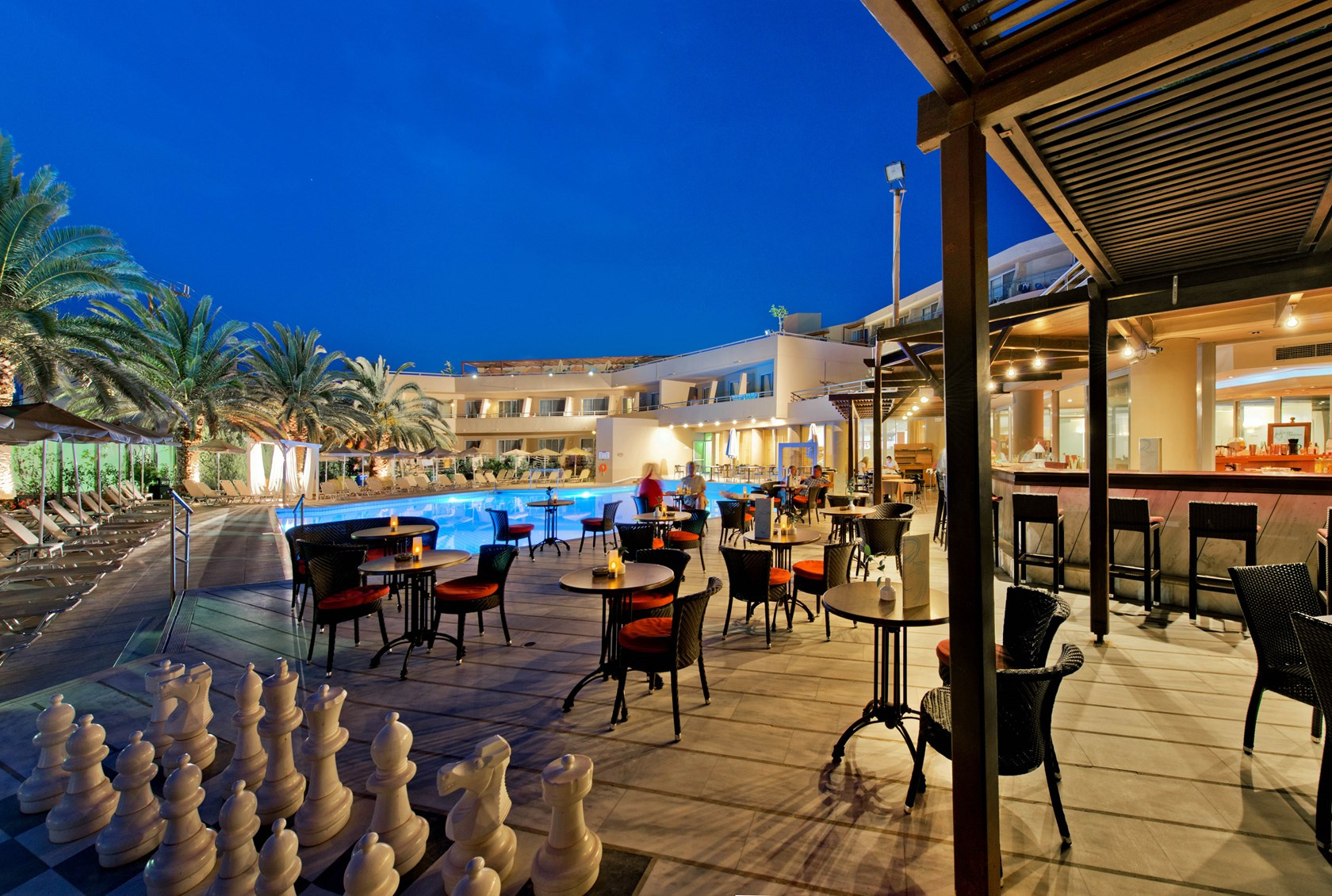 A szobák nagyrészt a medencére vagy a kertre néznek, néhány szoba tengerre néző kilátással rendelkezik.