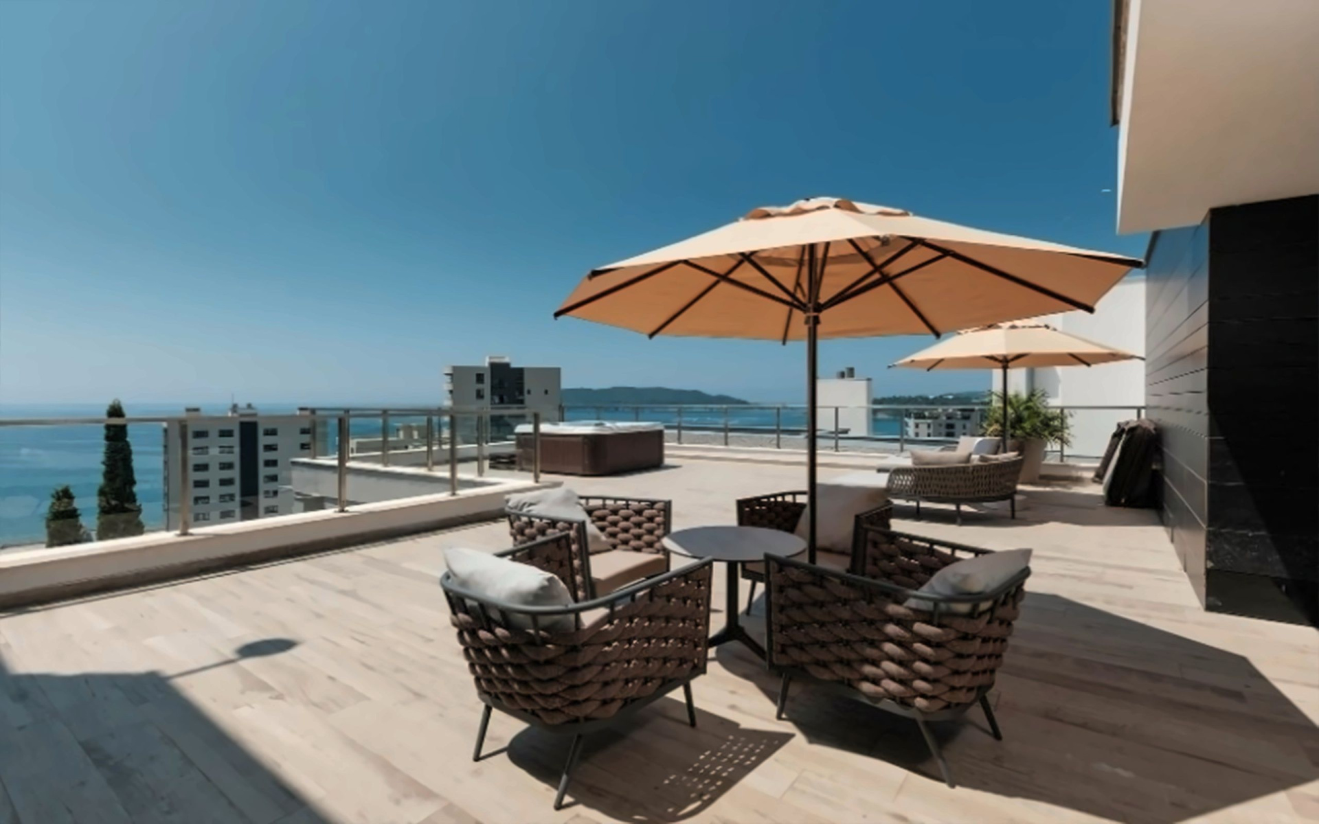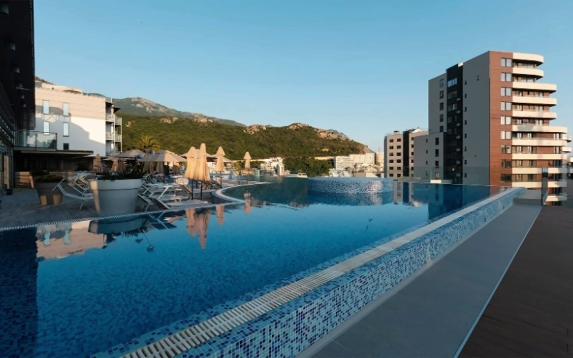 - szabadtéri panoráma medence a teraszon napozóágyakkal és napernyőkkel