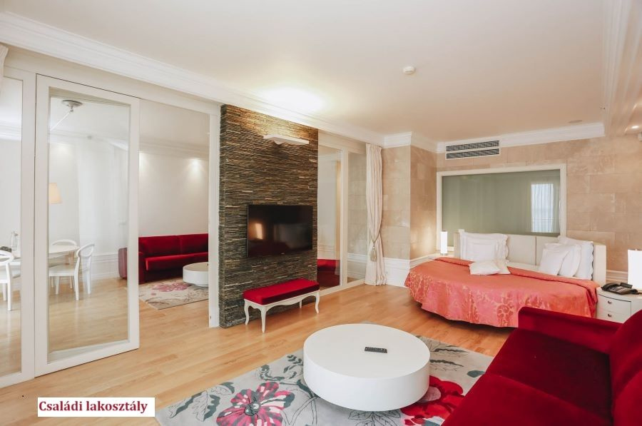 • Családi lakosztály (Family Suite): 84m2, tengerre néző erkély, nappali két kanapéval (1,6 x1,9m), hálószoba franciaággyal, gardrób, fürdőszoba zuhanyzóval/káddal. A szobában legfeljebb 6 fő szállásolható el.