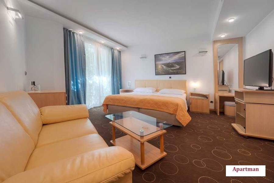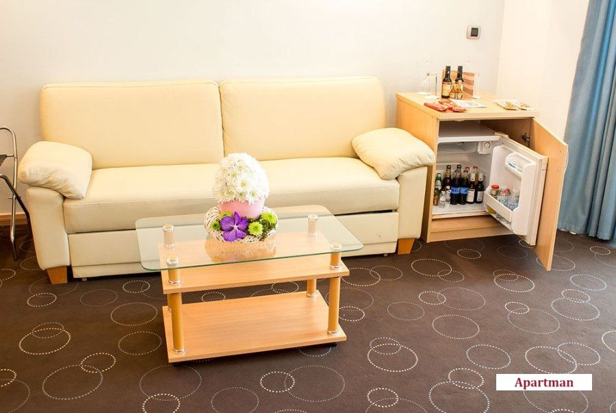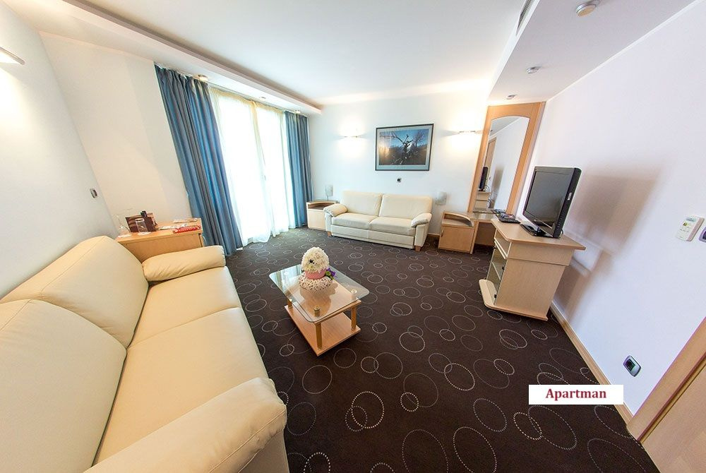 - Egy hálószobás apartman (Apartman): 50 m², parkra néző erkély, nappali kanapéval, hálószoba franciaággyal, saját fürdőszoba káddal/zuhanyzóval. Legfeljebb 4 fő elszállásolására alkalmas.