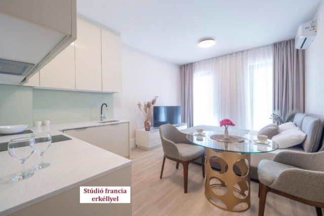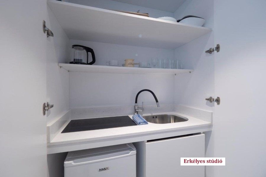 Egyes szobákban: konyhasarok hűtőszekrénnyel, tűzhellyel, konyhai eszközökkel, elektromos vízforralóval