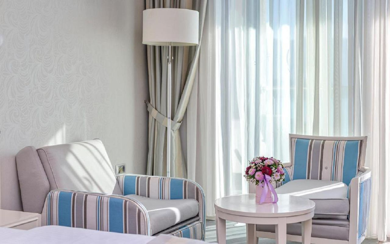 - Tengerre néző lakosztály (Suite SV): 60-75 m2, tengerre néző erkély, a nappaliban: kanapé, fotel, kisasztal, konyhasarok, étkezőasztal és székek. A hálószobában: nagy franciaágy + egy egyszemélyes ágy, fésülködőasztal és egy szék, erkély; Fürdőszoba zuhanyzóval. Maximális befogadóképesség: 3 felnőtt + 1 gyermek