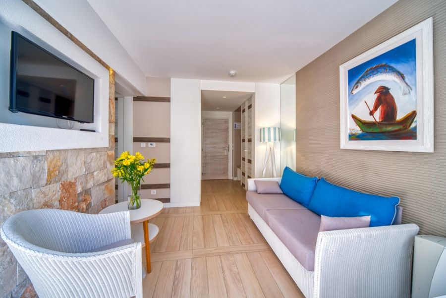- Családi szoba (Family room): 44 m2, erkély kilátással a kertre, két kétágyas szoba összekötő ajtóval, mindegyik franciaággyal vagy két külön ággyal, 2 fürdőszoba zuhanyzóval. Maximum férőhely: 4 fő