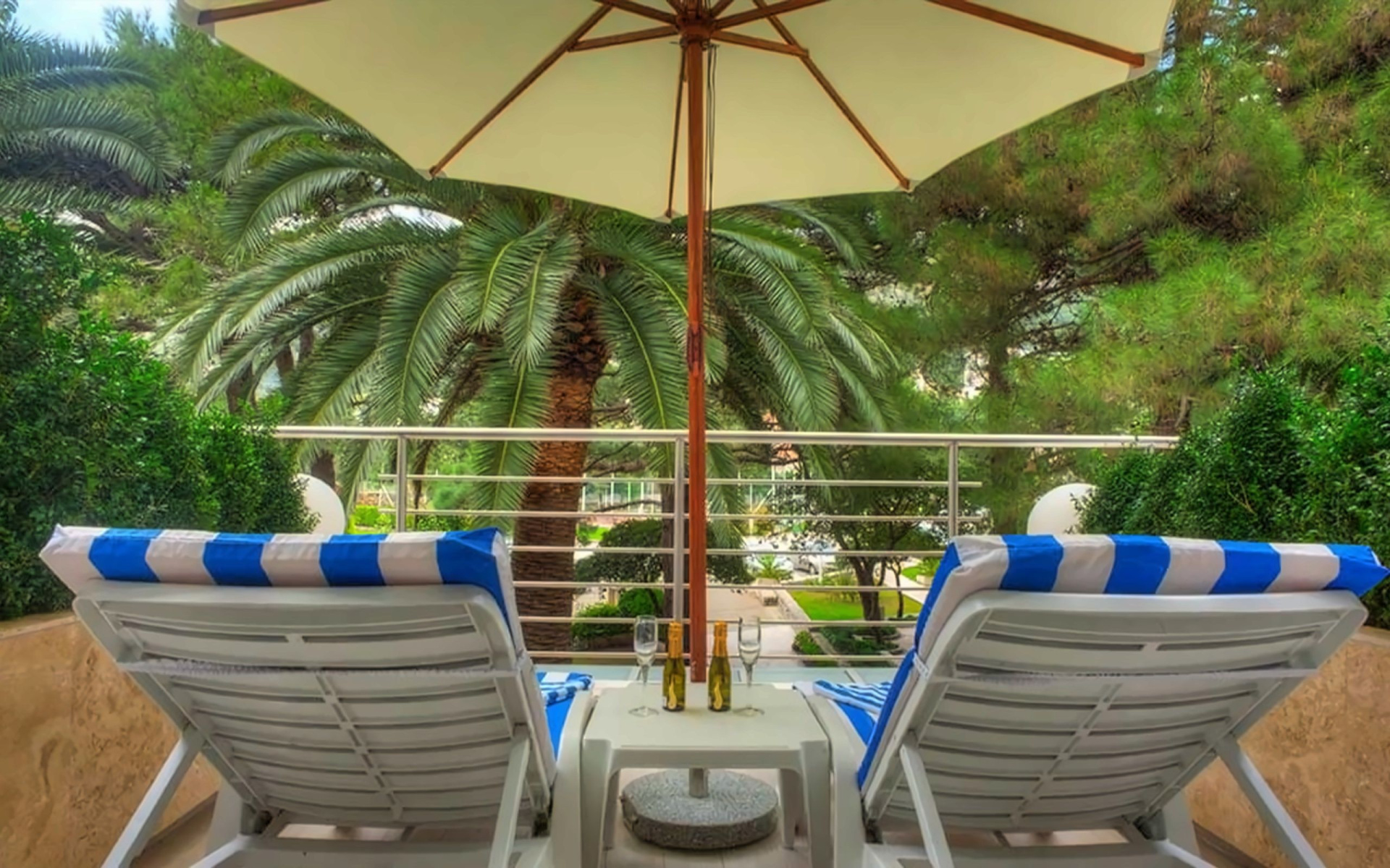 A fák árnyékában, a medence melletti ingyenes napozóágyakon pihenve a szálloda vendégei élvezhetik a mindössze 30 méterre lévő tengert.