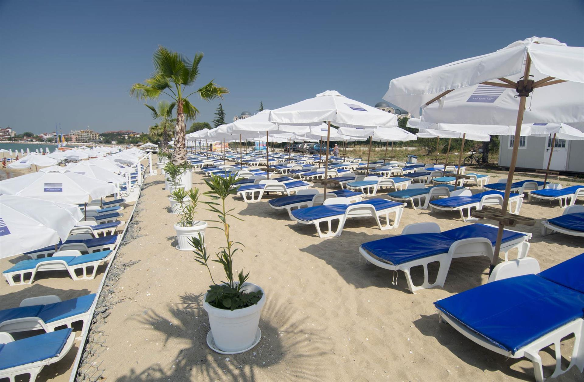 Napozóágyak, napernyők és strandtörülközők biztosítva vannak.