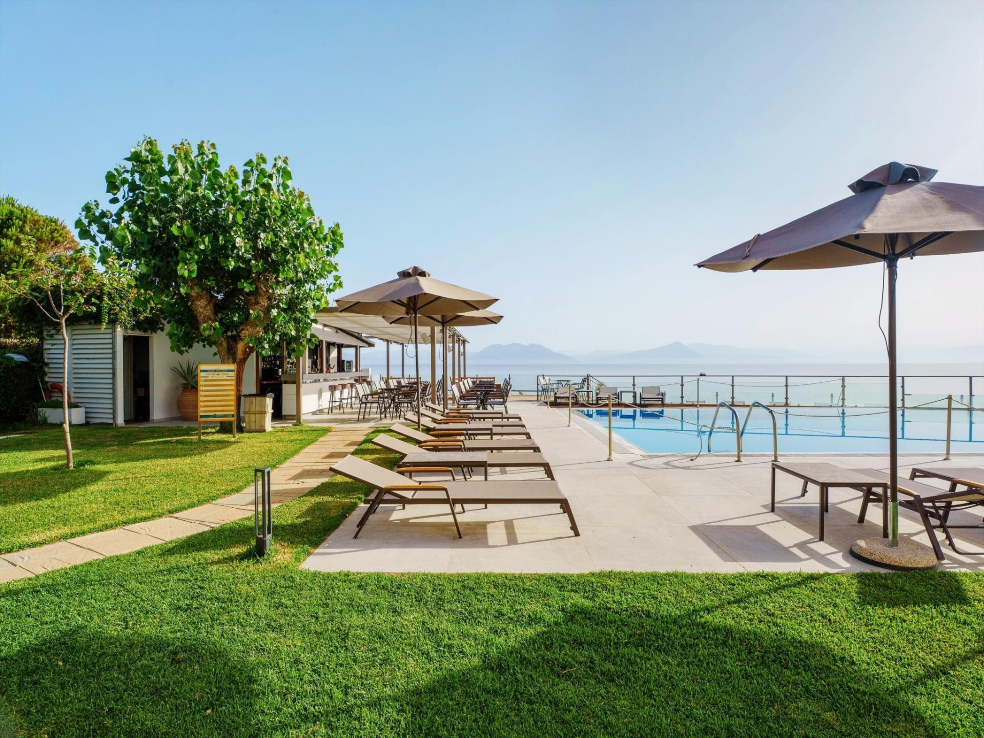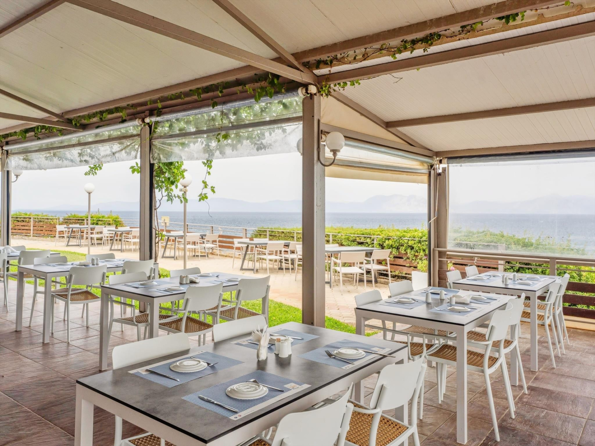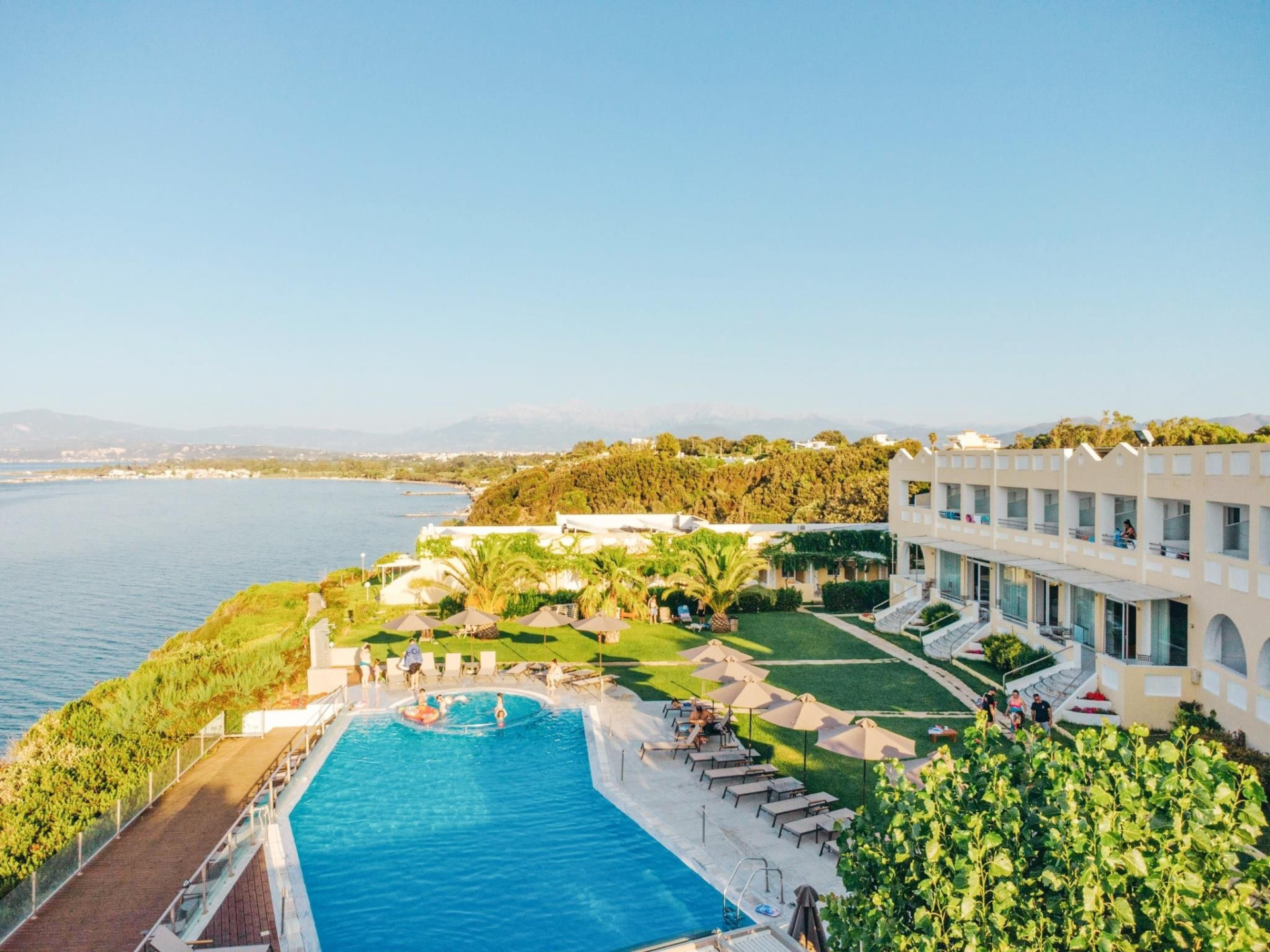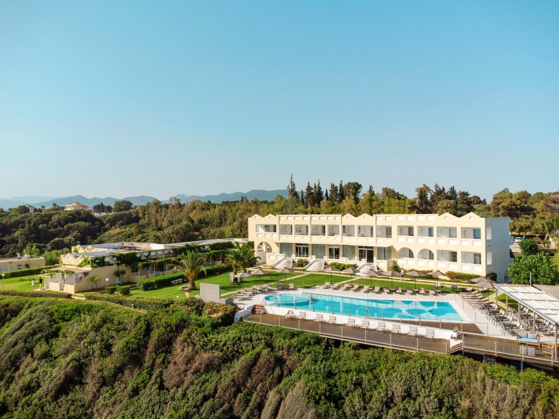 A szállodakomplexum főépületből és földszintes bungalóépületből áll. Peloponnészosz nyugati részén, csendes környezetben, egy szépen gondozott kertben található, közvetlenül egy kavicsos/homokos strand felett. A létestíményből csodálatos kilátás nyílik a Patrasz-öböl-re. A kb. 3,5 km-re fekvő Kato Achaia városába helyi buszokkal is le lehet jutni, és több taverna, kávézó és kis üzlet is rendelkezésre áll. Ideális választás párok és egyedül utazók számára.