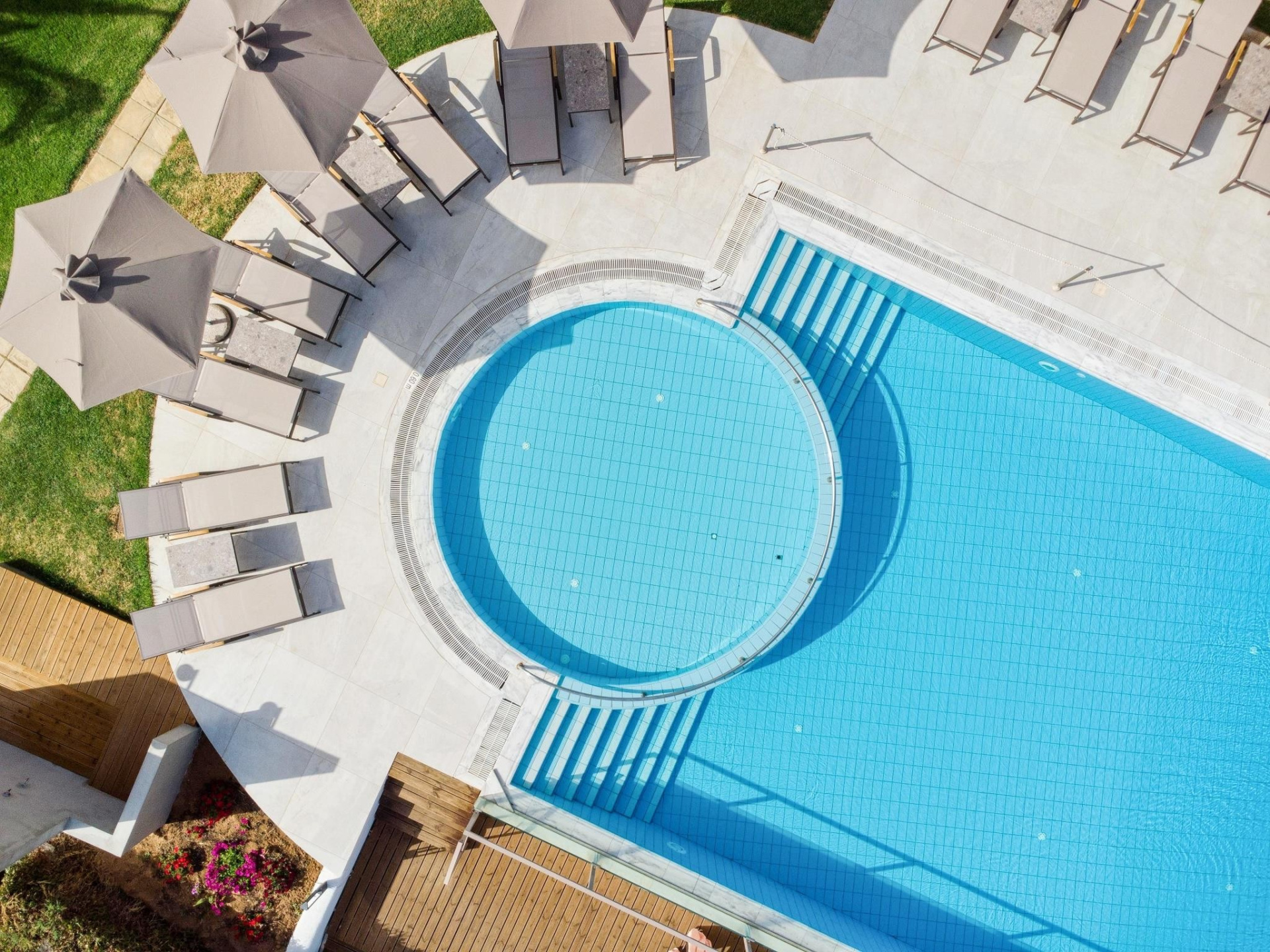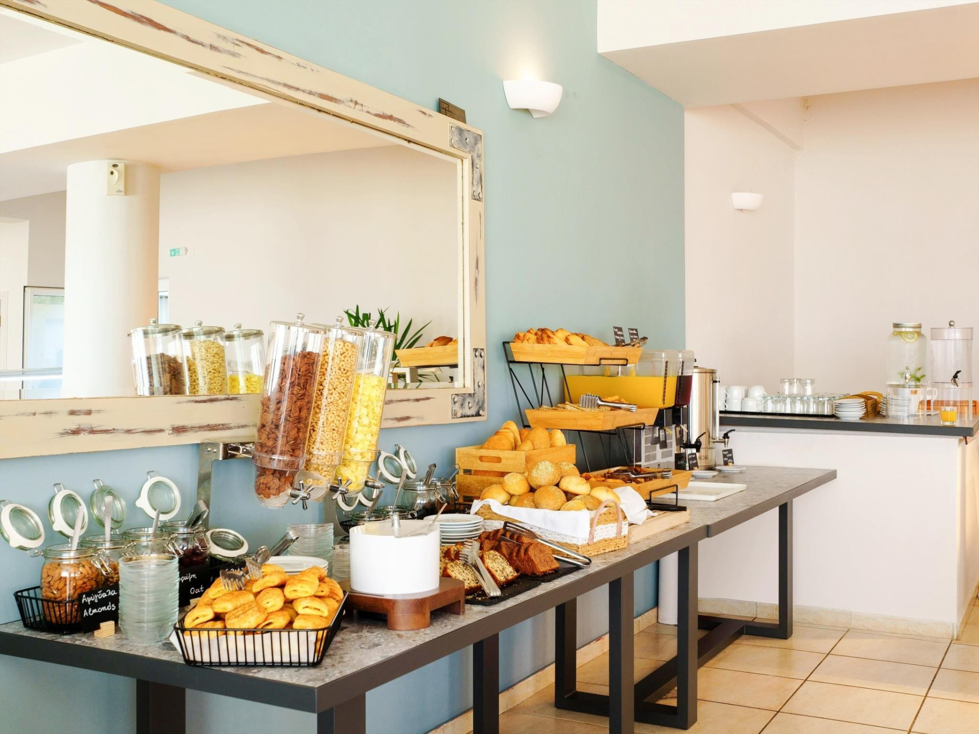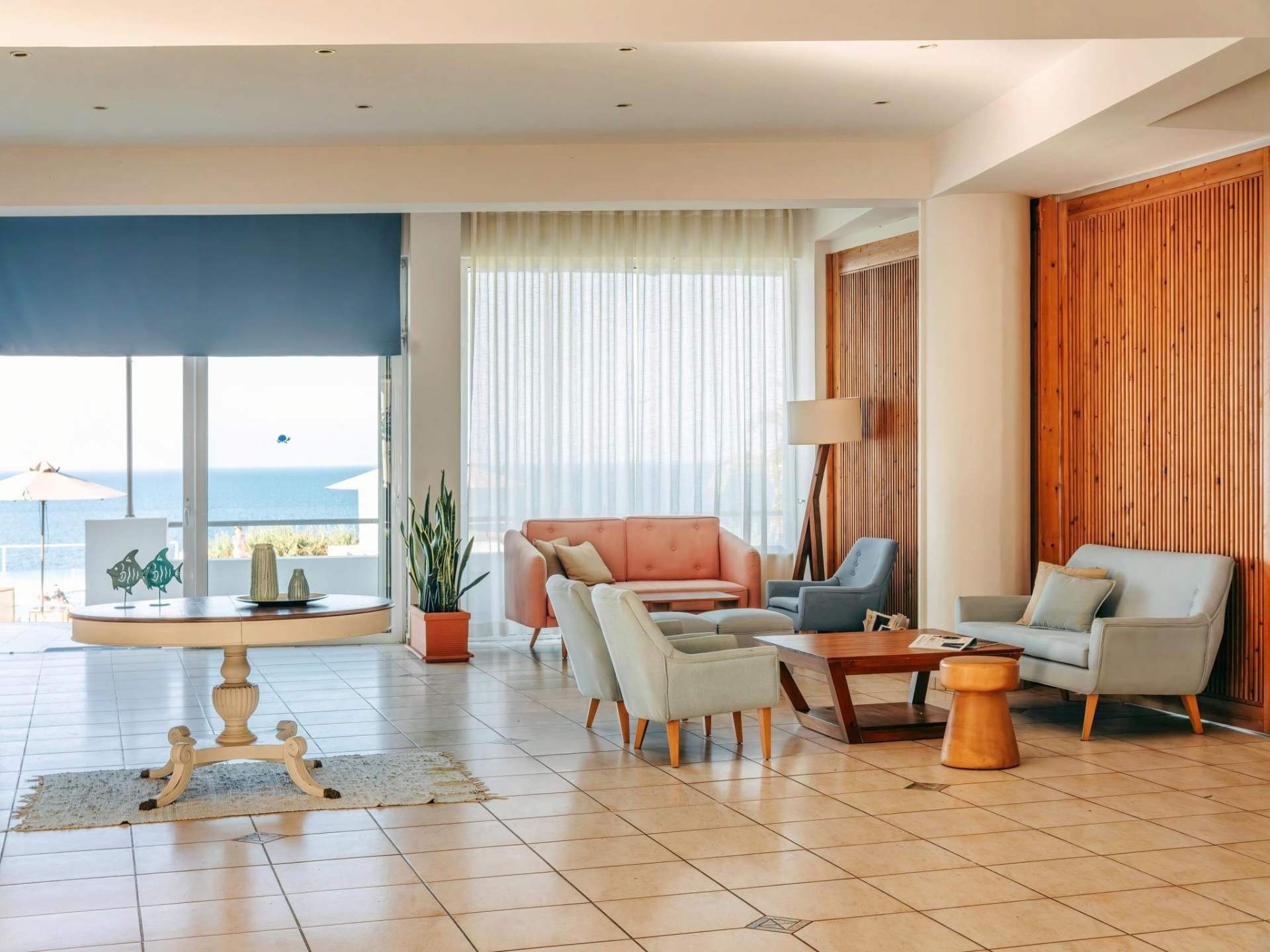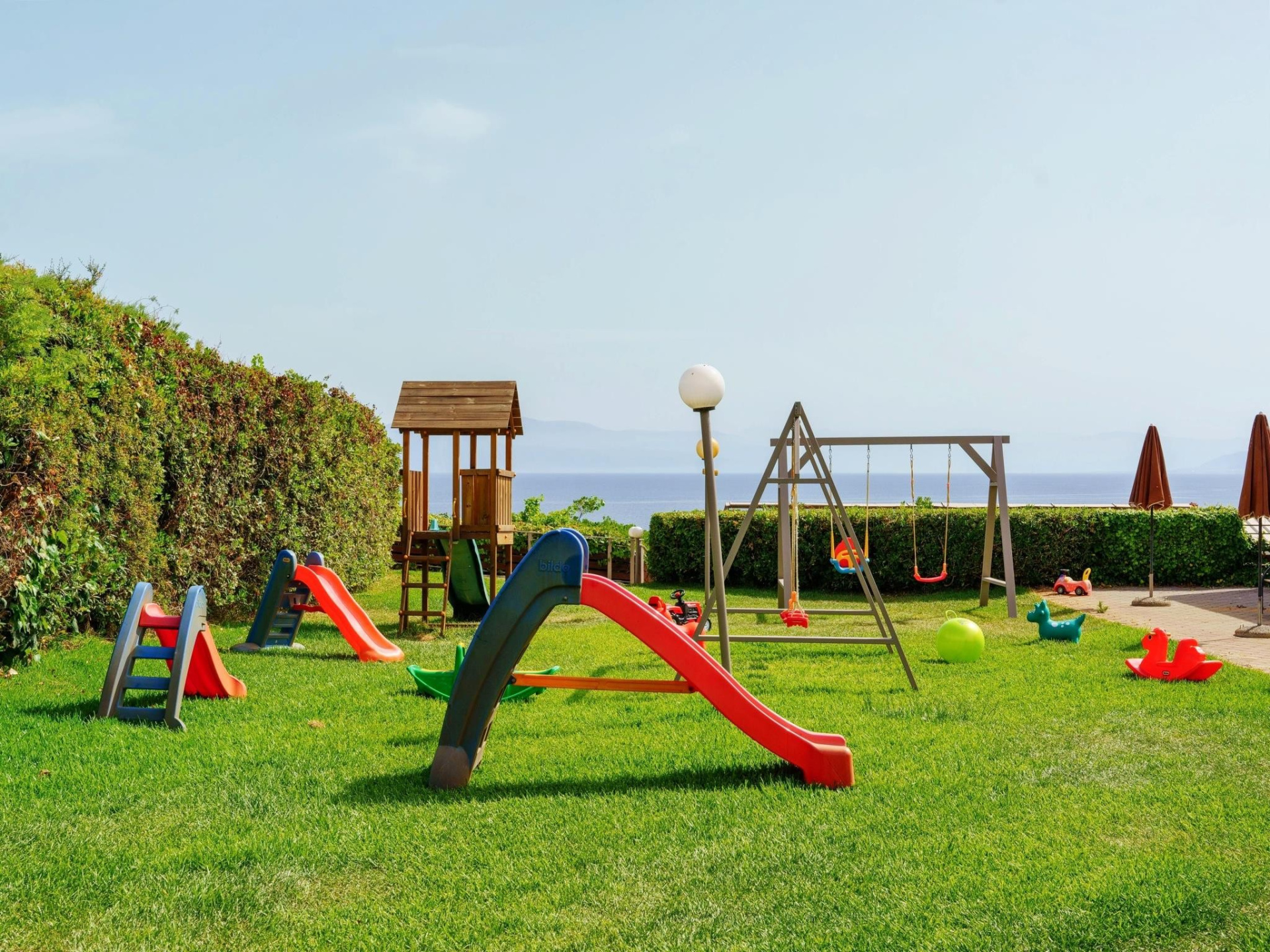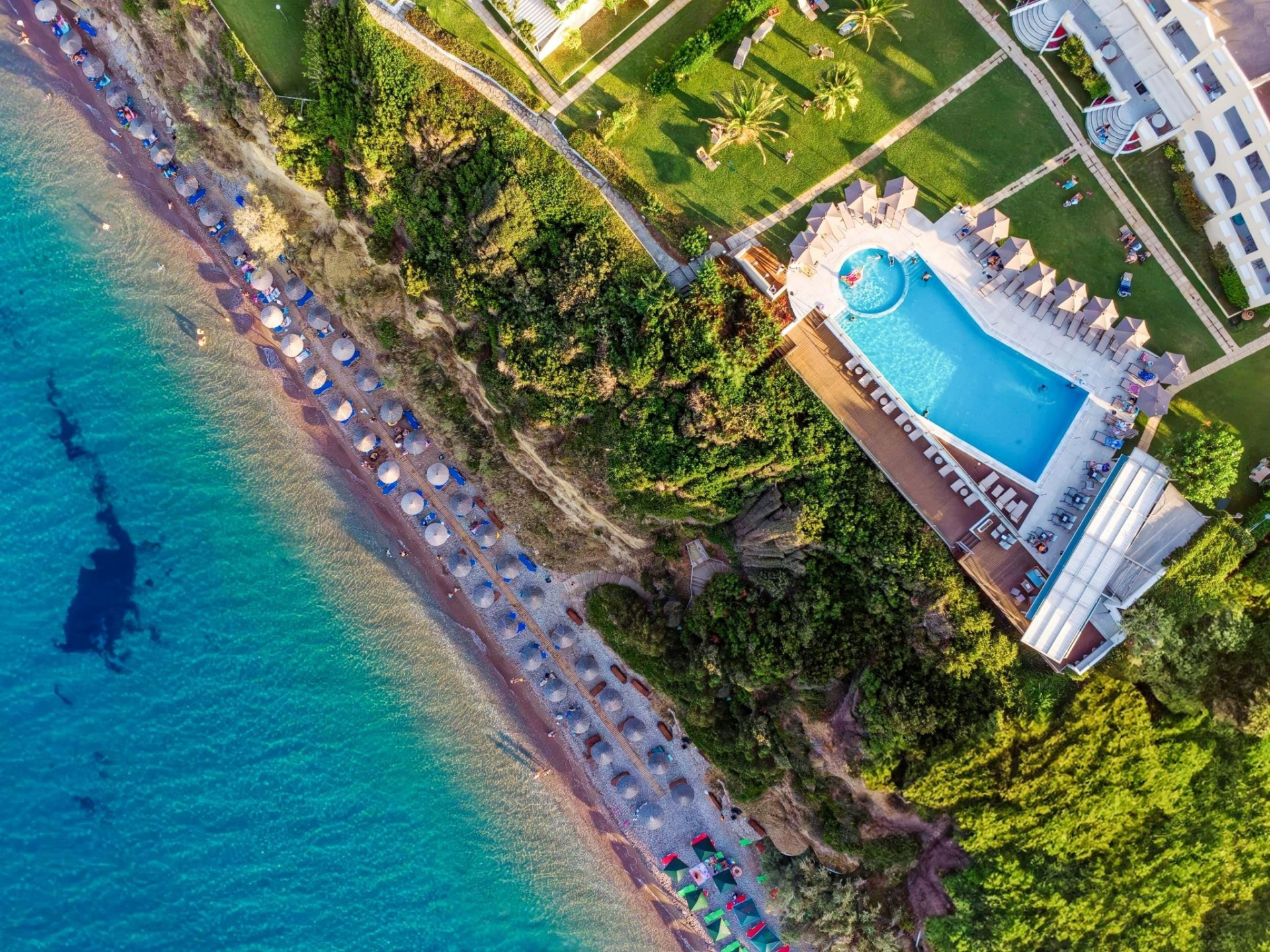 A szállodakomplexum főépületből és földszintes bungalóépületből áll. Peloponnészosz nyugati részén, csendes környezetben, egy szépen gondozott kertben található, közvetlenül egy kavicsos/homokos strand felett. A létestíményből csodálatos kilátás nyílik a Patrasz-öböl-re. A kb. 3,5 km-re fekvő Kato Achaia városába helyi buszokkal is le lehet jutni, és több taverna, kávézó és kis üzlet is rendelkezésre áll. Ideális választás párok és egyedül utazók számára.