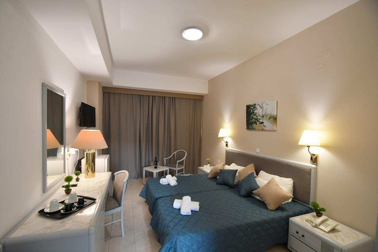Szobák: Az Olympos Beach hotel 213 szobával rendelkezik és a szobák mindegyike légkondicionált, televízióval, telefonnal, minibárral, széffel, a fürdőszoba hajszárítóval felszerelt. A szobák többségéhez erkély vagy terasz tartozik.