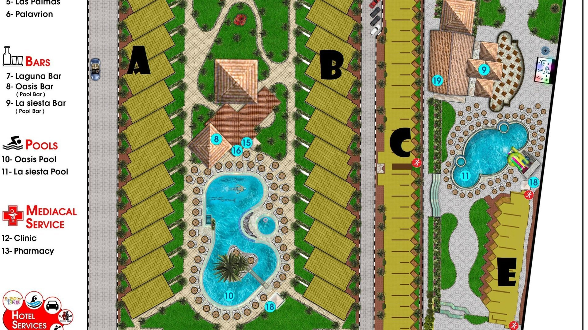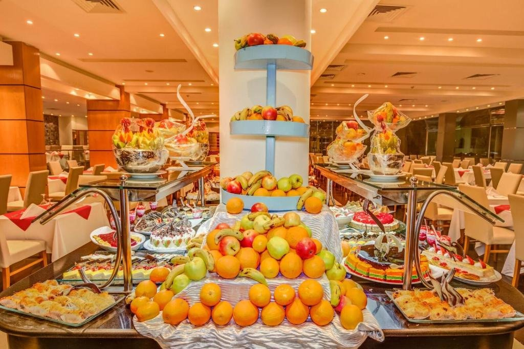 A üdülőhely 395 szobával rendelkezik, melyek 6, 2-5 emeletes épületben helyezkednek el. A szálloda 24 órás recepcióval, bárral ellátott előcsarnokkal, légkondicionálóval, Wi-Fi-vel (ingyenes a hallban), konferenciateremmel, lifttel, teraszos büféétteremmel, bárral, fodrászattal és számos vásárlási lehetőséggel várja vendégeit. A kültéri területen 2 úszómedence és 1 gyermekmedence található napozóteraszokkal és medencebárral. A napozóágyak, párnák, napernyők és strandtörölközők a medencénél és a strandon is benne vannak az árban.