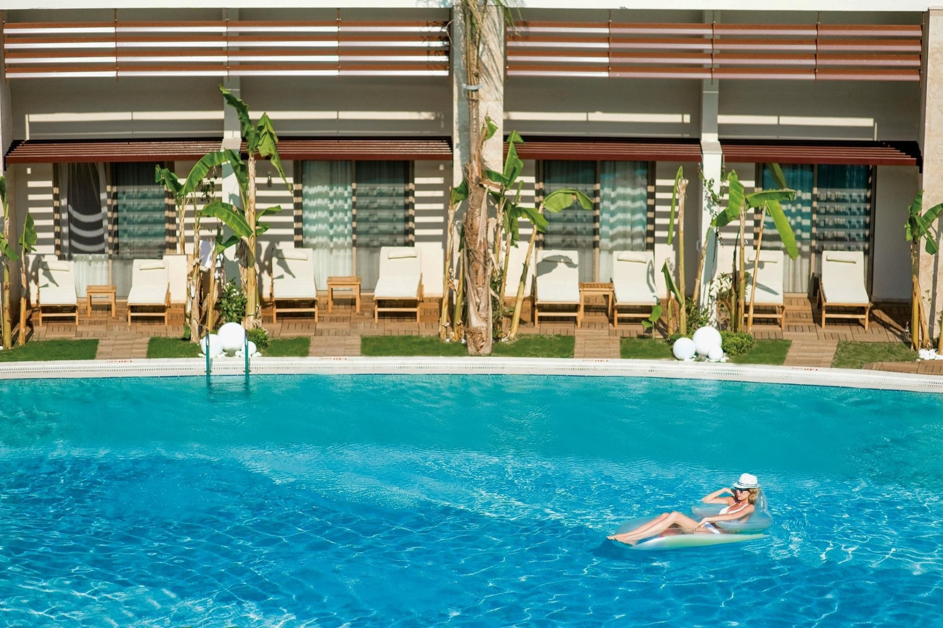 - 2 medence (az egyik csúszdákkal), napágyak, napernyők és törölközők ingyenesen