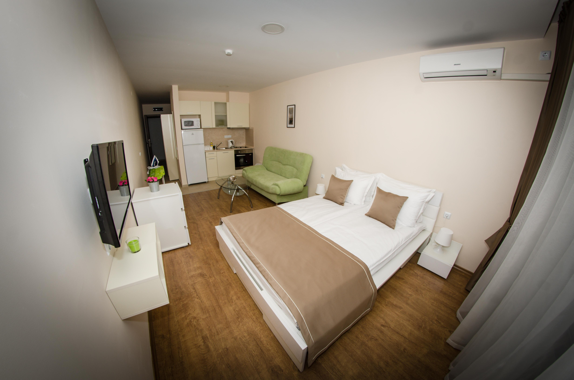 Apartman egy hálószoba kb.70 nm,(max 2+2); franciaágy, kihúzható kanapé, egy fürdőszoba.
