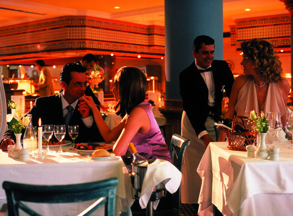 All-inclusive és félpanziós ellátás igényelhető • Fő étterem Reggeli: Változatos büféreggeli, főzőállomásokkal és igény szerint pezsgővel. Vacsora: Hideg és meleg svédasztalos ételek, főzőállomásokon készített frissensültek, desszert büfé. Vegetáriánus opció is kérhető. Tematikus büfévacsora (hetente kétszer) Ebéd: À la carte választék, medence partján tapas bár. all-inclusive vendégeknek svédasztalos kiszolgálás, főzőállomások és desszertválogatás. Öltözet: Uraknak a vacsorához ajánlott a hosszú nadrág viselete. • Krystal Fúziós étterem, foglalás szükséges Klasszikus és nemzetközi konyhák ötvözete • Italok: helyi és válogatott import italok kaphatók a szálloda bárjaiban és éttermeiben 01:00 óráig.