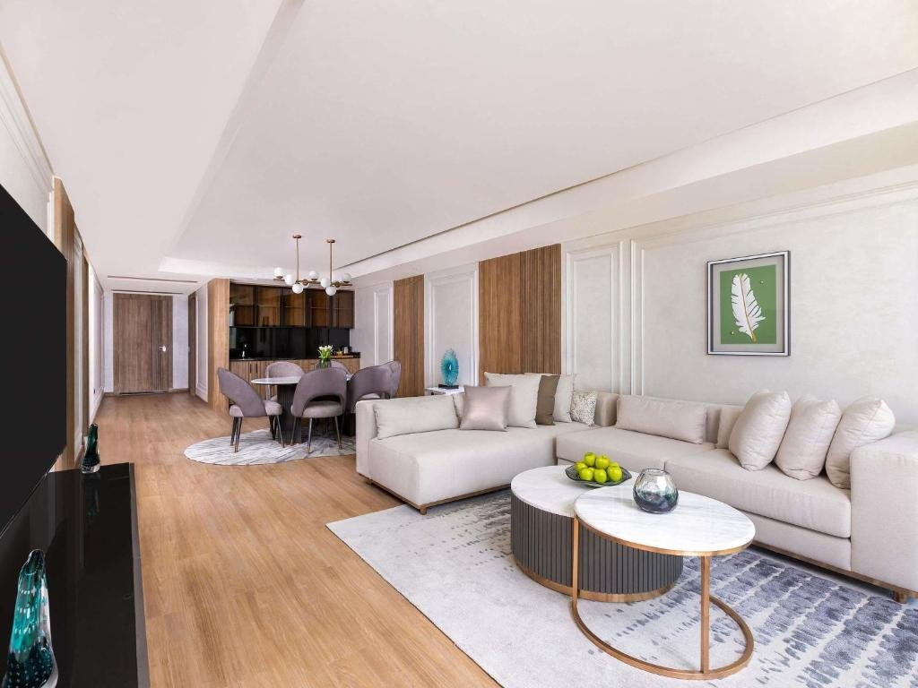 Superior Room Beach Side (DB2) Tágas hálószoba kényelmes ülőgarnitúrával, TV-vel és modern fürdőszobával, frissítő zuhannyal, tengerparti kilátással.