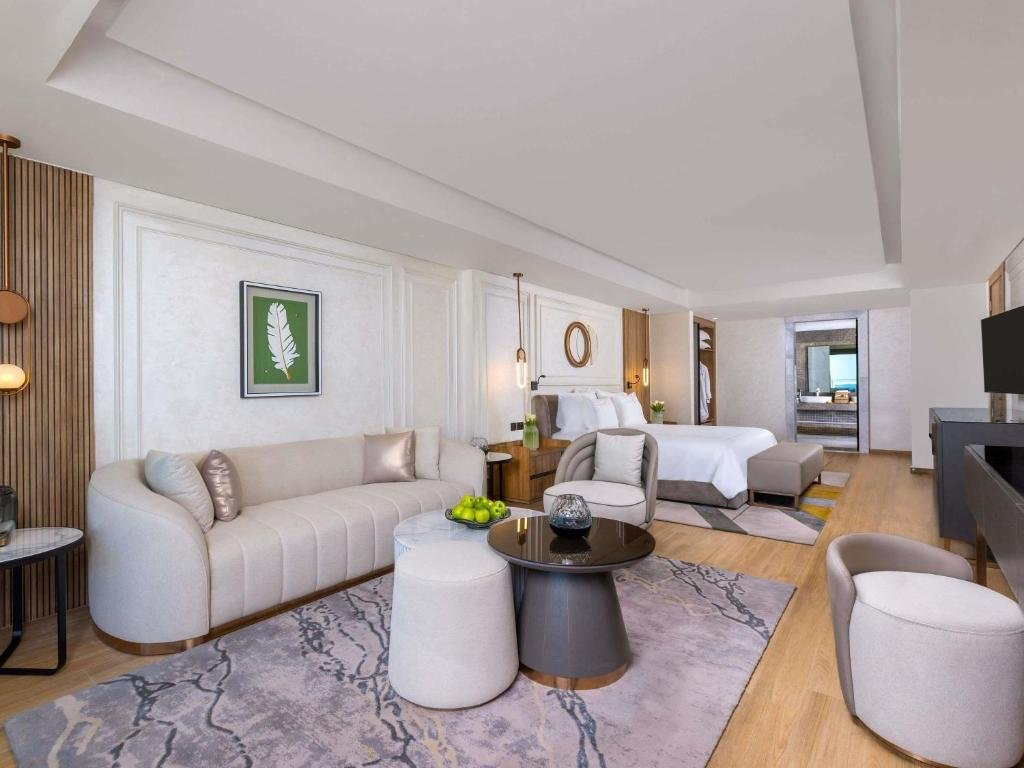 Deluxe Room Beach Side (DXU) Elegáns hálószoba nappali résszel, TV-vel és modern fürdőszobával, frissítő zuhannyal, tengerparti kilátással.