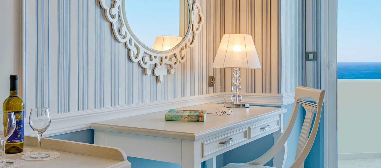 2 alapterületű, tengerre néző kilátással, tea- és kávékészítési lehetőséggel és köntössel felszerelt szoba.
