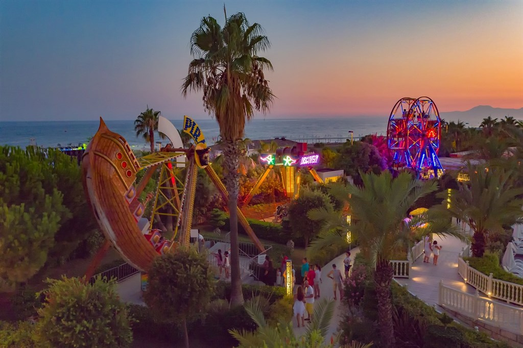 A medencéket, vízi csúszdaparkot és a mini vidámparkot csodálatos kertek, datolyapálmák övezik.