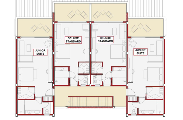 - Swim-up Junior-suitek - tágasabbak, kijárattal a külön közös medencéhez (4 földszinti szobához 1 medence tartozik), kertre vagy medencére nézők