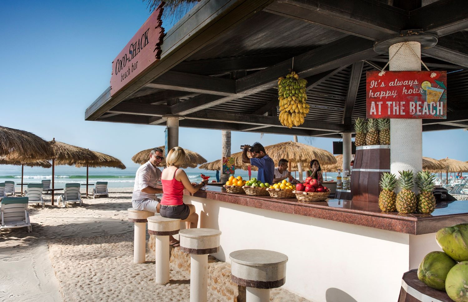 A széles, fehérhomokos, pálmafákkal tarkított tengerparti szakaszán a napernyők és napágyak ingyenesen vehetők igénybe.