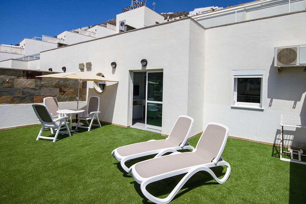 A Servatur Terrazamar & Sunsuites apartmanhotel körülbelül 1,5 km-re fekszik a homokos strandtól. A legközelebbi éttermek és bárok 350 méteren belül találhatók. A város központja körülbelül 350 méterre van. A legközelebbi üzletek körülbelül 250 méteren belül elérhetők, egy szupermarket pedig csak néhány méterre található a hoteltől. A közelben található egy diszkó, amely a főszezonban szórakozási lehetőséget kínál.