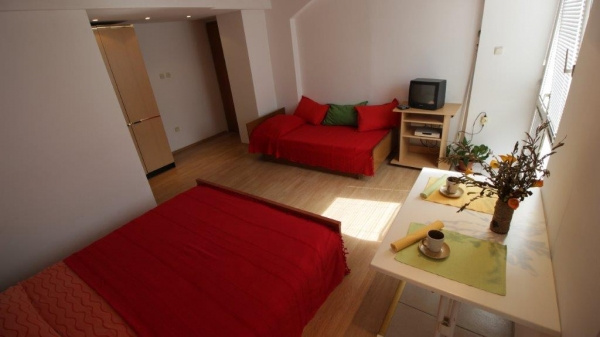 SM2+1 ágyas: stúdió, 22 nm /1 db, tetőtéri (nappali franciaággyal, gyermek pótágy, konyhasarok, TV, klíma, fürdőszoba, tengerre néző erkély).