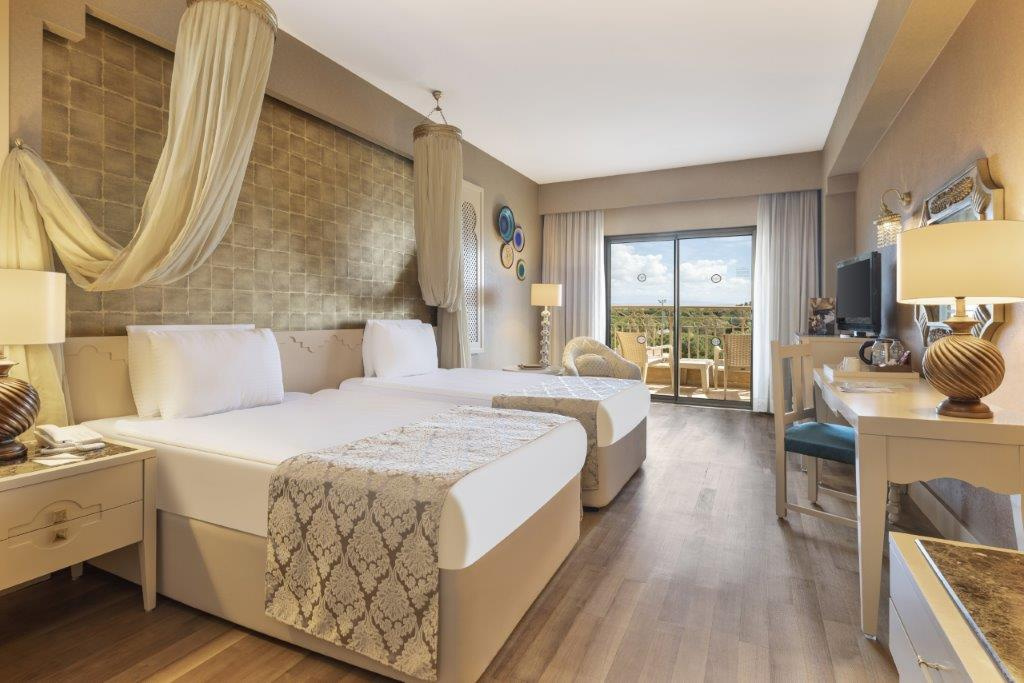 Fekvése: A 2007-ben nyílt, kívül marokkói, belül indiai stílusban berendezett szálloda az antalyai repülőtértől mintegy 35 km-re, Belek központjától 2 km-re fekszik, 91.000 nm-es területen. A főépületből, 2 melléképületből és 22 VIP villaépületből álló hotel közvetlenül saját, 270 méter hosszú, homokos tengerpartján található. A központba taxival vagy helyi járatú busszal (dolmussal) könnyen be tudunk jutni. Szolgáltatások: 5000 nm-es medence napernyőkkel és napozóágyakkal, gyermekmedence, aquapark 7 csúszdával, félolimpiai belső medence medence a villavendégeknek, főétterem, 4 a’la carte étterem, 4 bár, nappali és esti animációs programok, show-műsorok, élő zene, diszkó, főszezonban hetente tematikus partik, miniklub (4-12 éves korig), minidisco, fitneszterem, törökfürdő, szauna, gőzfürdő, szauna, jakuzzi, 4 teniszpálya (előzetes foglalással), boccia, darts, íjászat, mini foci, strandröplabda, kosárlabda, vízi labda, aerobik, pilates, jóga, asztalitenisz, WIFI a szobákban és a lobbyban. A szálloda saját strandján a napernyők, napozóágyak, matracok és strandtörölközők ingyenesen használhatók. Térítés ellenében: 3.500 nm-es Spa és wellness központ kezelései, különféle masszázsok, fodrászat, teniszfelszerelés, sportpályák világítása, teniszoktatás, FIFA standard futballpálya, játékterem, számítógépes játékok, bowling, üzletek, mosoda, gyermekfelügyelet, babakocsi bérlés, orvosi ellátás, vízi sportok, golf a közelben, privát pavilonok. Elhelyezés: Az 546 ízlésesen, keleti stílusban berendezett szoba mindegyike központi légkondicionálóval (meghatározott időpontban működik), telefonnal, hajszárítóval, műholdas tévével, WIFI internetkapcsolattal, minibárral, széffel és erkéllyel vagy terasszal rendelkezik. A Standard szobák 36 nm-esek, maximum kapacitásuk 3 felnőtt. A medencére néző szobák a szálloda melléképületében helyezkednek el. A családi szobák a melléképületben találhatóak, 72 nm alapterületűek és két, ajtóval elválasztott hálószobával rendelkeznek. A Lakosztályok főépületiek, 67 nm alapterületűek, egy részük egy hálószobából és egy nappaliból, egy részük pedig két hálószobából áll; mindkét típusú lakosztályban 1 fürdőszoba található. A szállodában többféle lakosztály és villa is foglalható. Ellátás: Ultra All Inclusive: reggeli, ebéd és vacsora büférendszerben, frissen facsart narancslé a reggelinél, korai (0:00-07:00 között) és kései reggeli, gyermekmenü és bébisarok a főétkezéseknél, különféle délutáni snackek, kávé/tea/sütemény, éjféli snack (23:00-00:00 között), gözleme, fagylalt és gofri (bizonyos időpontban), számos helyi és néhány import alkoholos és alkoholmentes ital (napi 24 órában), minibár (üdítők, víz és sör; naponta feltöltve). Térítés ellenében: bizonyos import italok, import pezsgők és borok, prémium és palackozott italok, 4 a’la carte étterem (török, olasz, hal, ázsiai; előzetes foglalással), Defne VIP étterem (a villavendégek részére ingyenes), szobaszerviz.Egyéb: