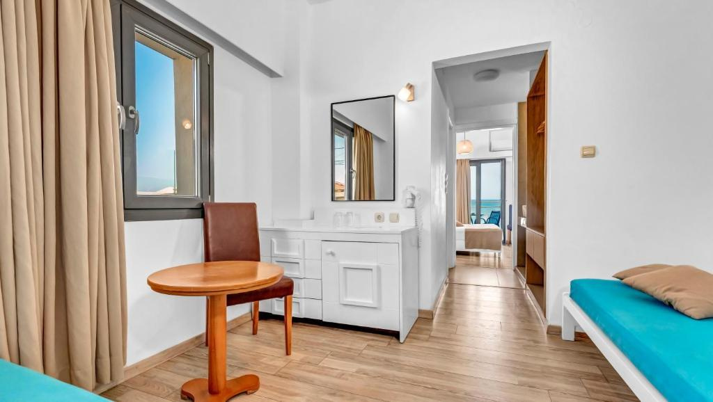 Szobák: minden szoba egyhálószobás (~ 22 m2), kellemes színvilágú, praktikusan berendezett, fürdőszobás, légkondicionálóval, hajszárítóval, hűtővel és Tv-vel felszerelt. A szobákhoz erkély tartozik kertre vagy tengerre néző kilátással. Családi lakosztályok hasonlóan berendezettek és felszereltek, azonban nagyobb alapterületűek (~32 m2), két légteresek (hálószoba 2 ággyal, és nappali kanapéval) és tengerre néző erkéllyel rendelkeznek. Felár ellenében széf a helyszínen bérelhető.
