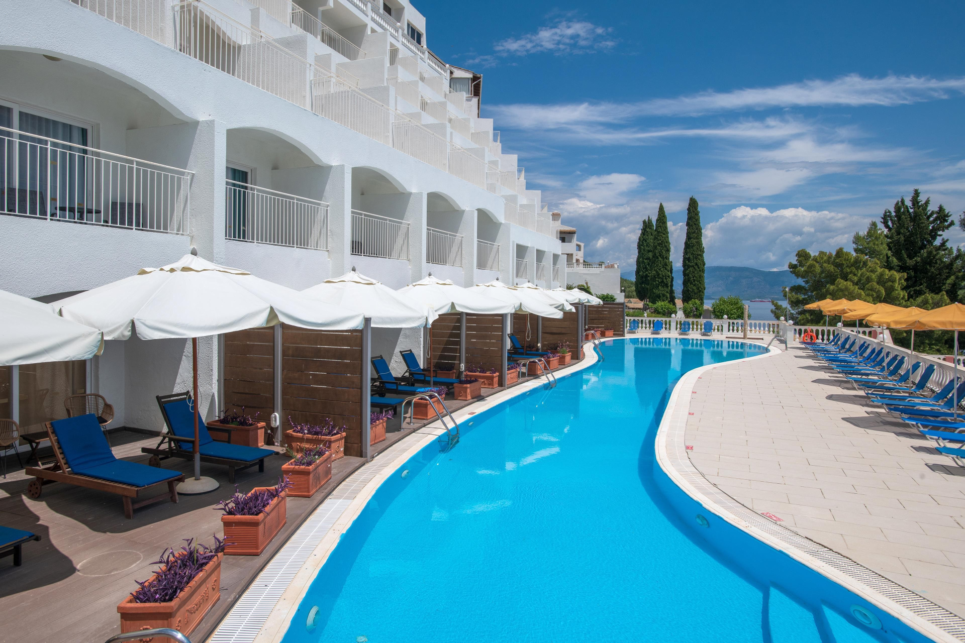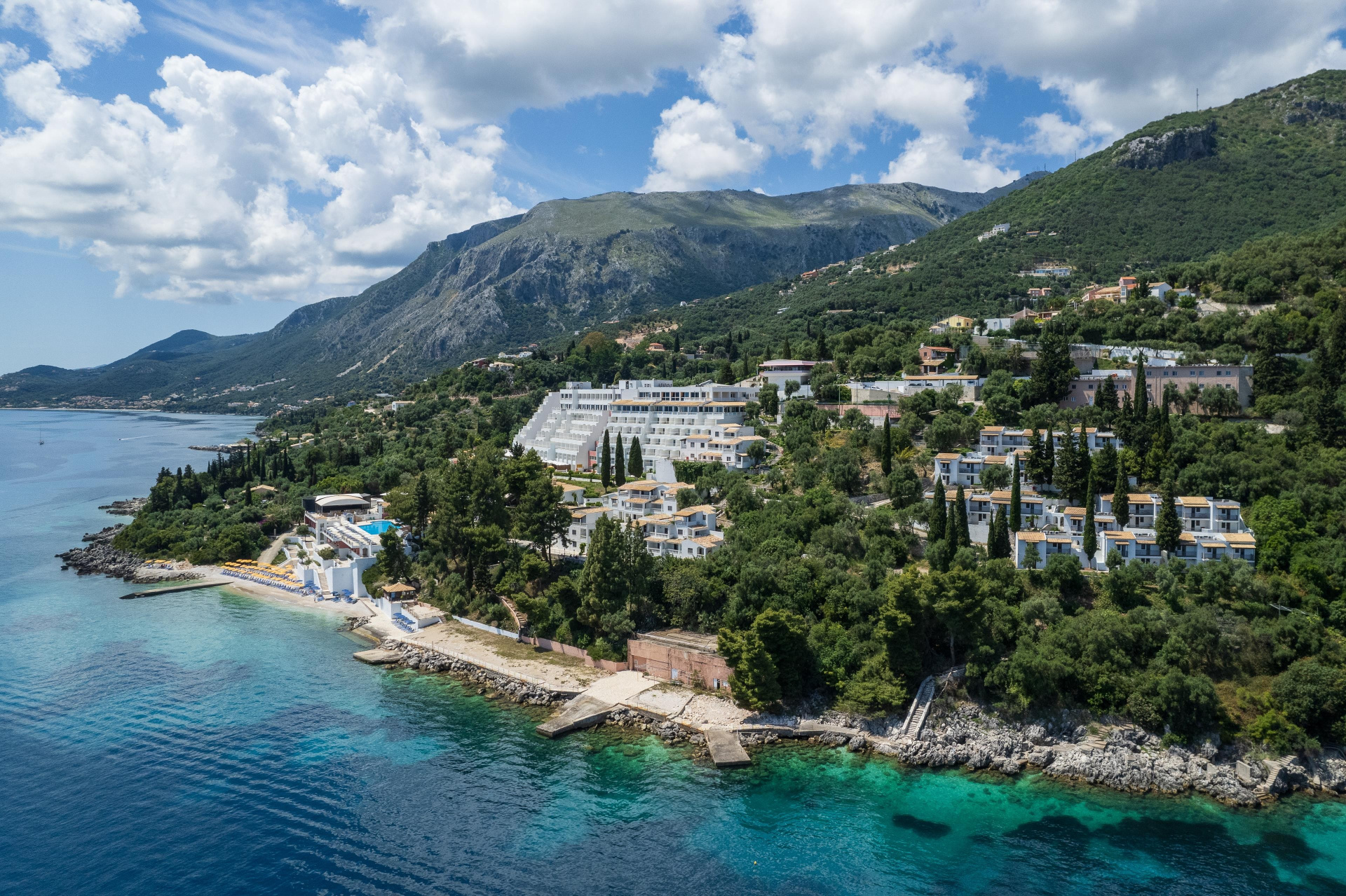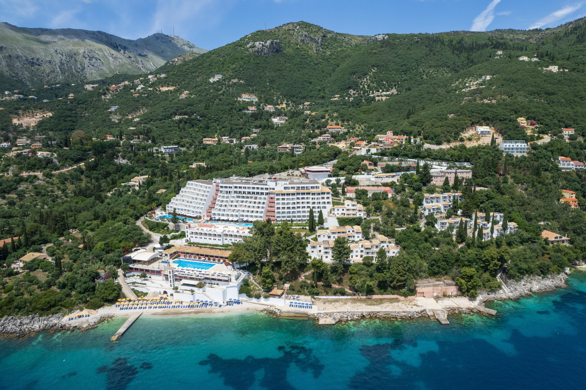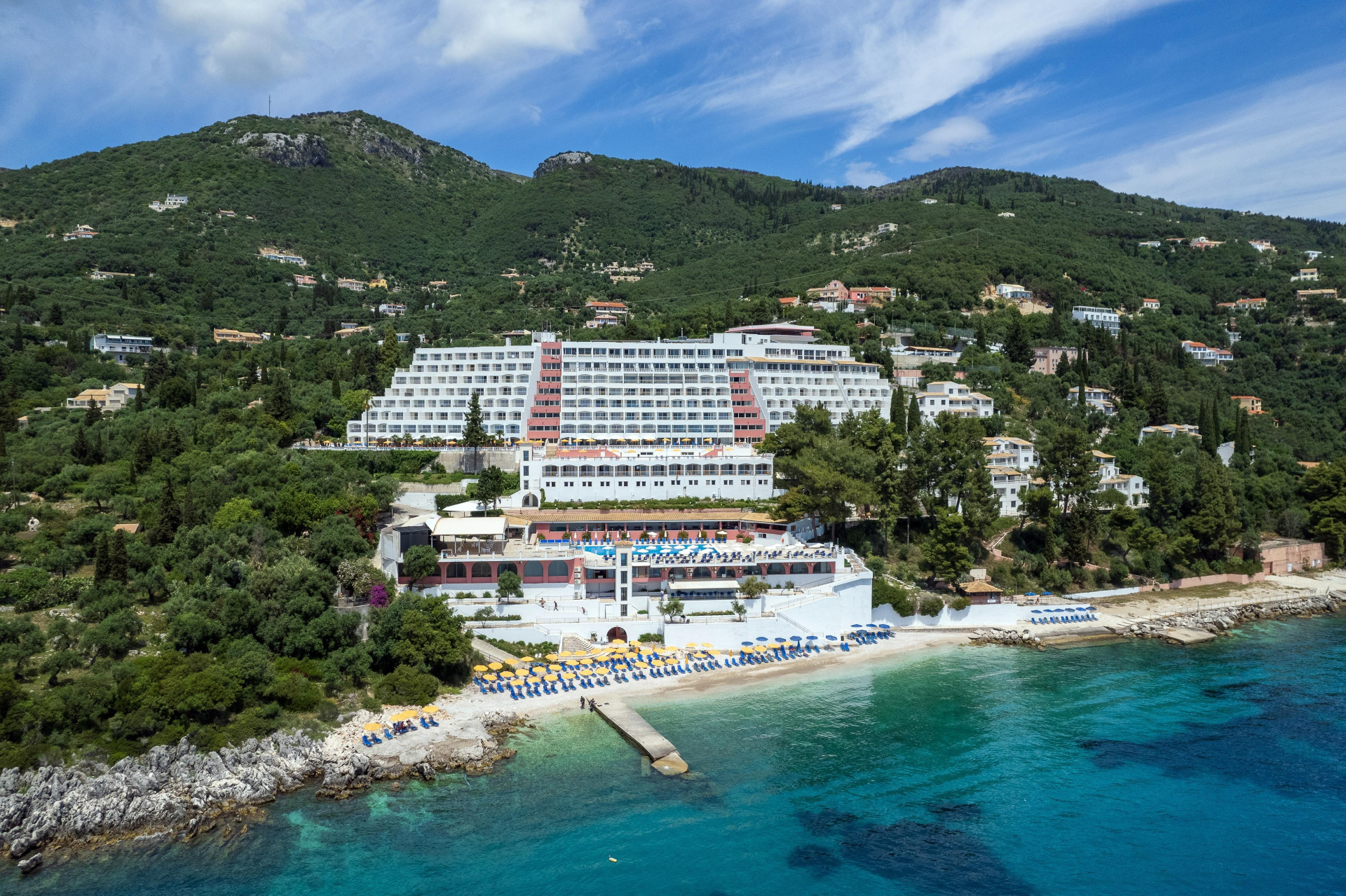 A nagy szállodakomplexum a sziget északi részén található, egy domboldalban, közvetlenül a sziget legmagasabb hegye, a Pantokrator alatt. Nissaki kb. 2 km-re, az ismert Barbati kb. 5 km-re, valamint a nyüzsgő Ipsos kb. 10 km fekszik. Kb. 1 km-re található a menetrend szerinti busz megállója, amellyel a fővárosba is el lehet jutni. A létesítmény privát homokos/kavicsos stranddal is rendelkezik, és a nyugodt környezet mellett számos sport- és szórakozási lehetőséget kínál vendégeinek. Ideális választás gyermekes családok számára.