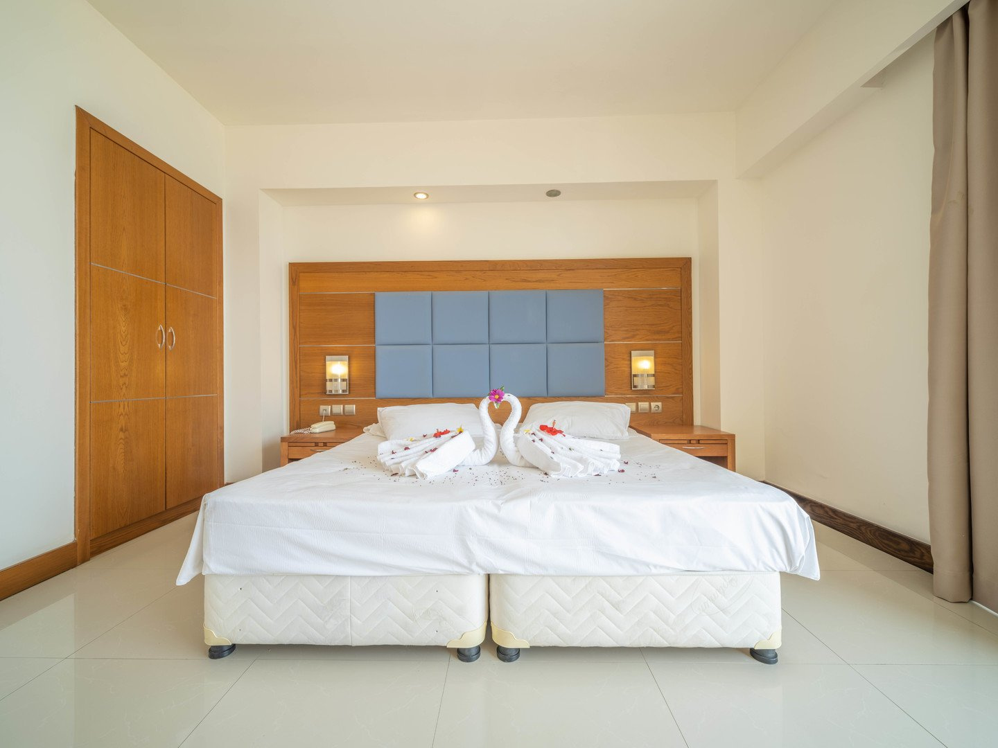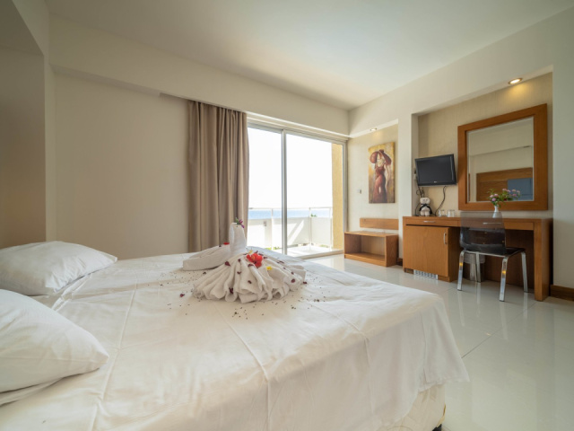 Kétágyas szoba kertre/tájra vagy felár ellenében tengerre néző kilátással: kb. 27 nm franciaággyal és kanapéággyal, max. 3 fő részére; kád vagy zuhanyzó;hajszárító, légkondícionáló, wifi, telefon, TV, mini hűtő, széf, bútorozott erkély vagy terasz.