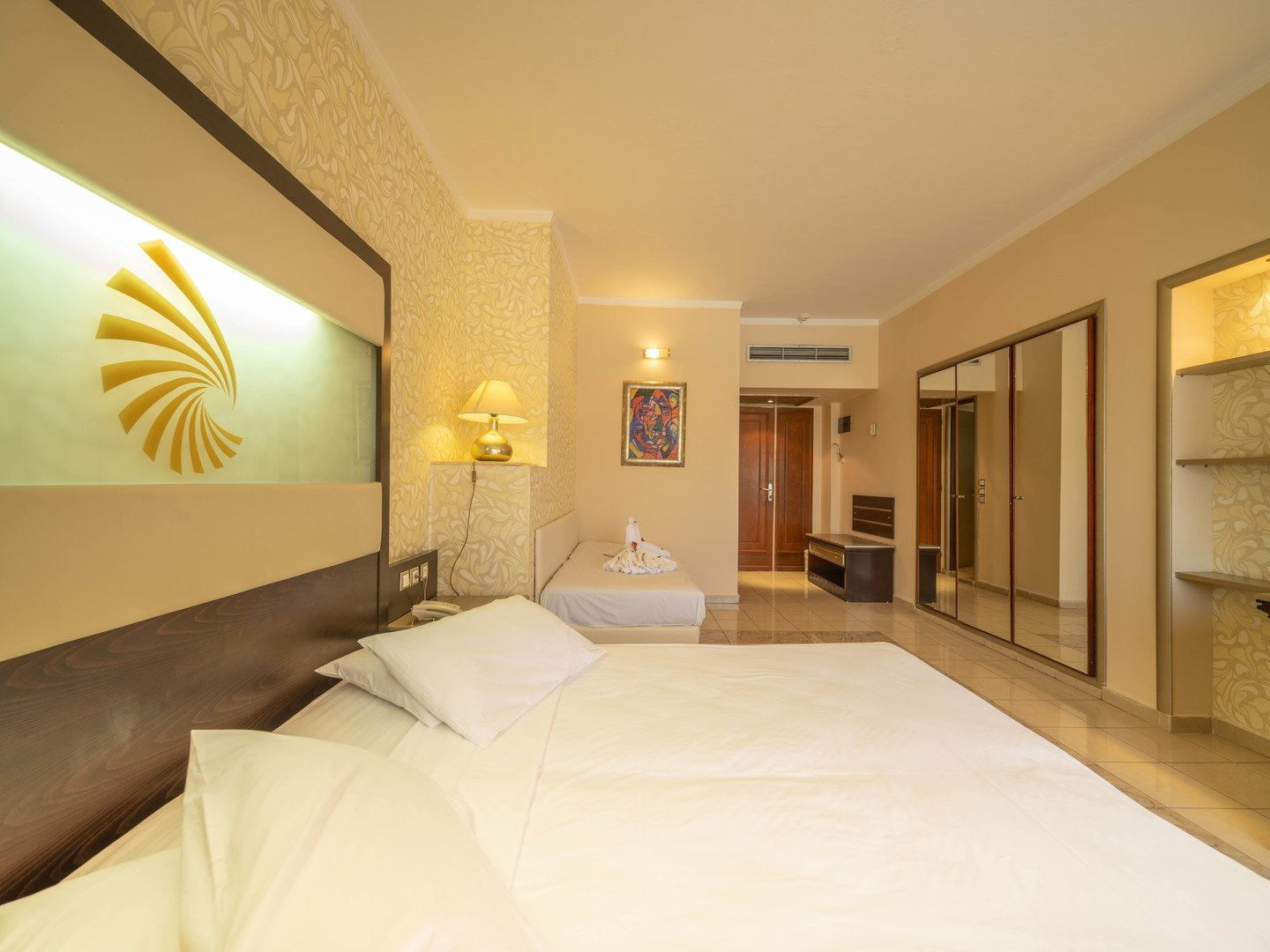 Kertre néző családi szoba: kb. 45 nm, két légtér (hálószoba+nappali 2 kanapéággyal) max. 2 felnőtt+ 2 gyerek részére;kád vagy zuhanyzó;hajszárító, légkondícionáló, wifi, telefon, TV, mini hűtő, széf, bútorozott erkély vagy terasz. Felár ellenében medencére vagy tengerre néző kilátással is foglalható.