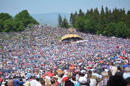 Csíksomlyóra. Itt felkapaszkodunk a Kis- és Nagy-Somlyó közötti nyeregbe, ahol több százezer zarándok társaságában részt veszünk a