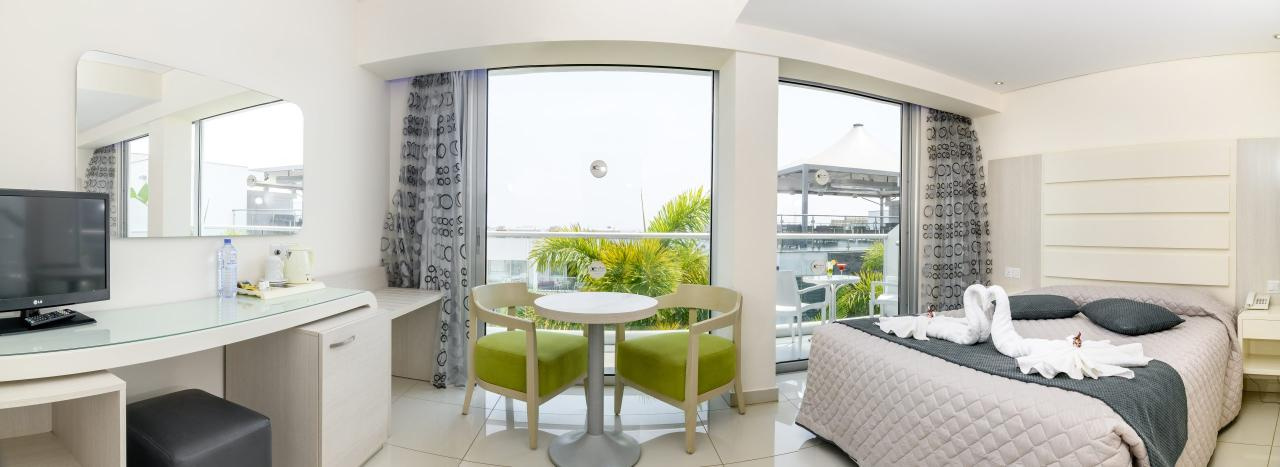 Szobák: minden szoba modern, minimalista stílusban berendezett, egy hálószobás (~23 m2), légkondicionált, fürdőszobás, hajszárítóval, telefonnal, síkképernyős tv-vel és vízforralóval (tea és kávéfőzési lehetőség) felszerelt. Széf és minihűtő térítés ellenében bérelhető. A szuperior családi szoba hasonló stílusban és felszereltséggel berendezett, azonban alapterülete nagyobb (~32 m2), kifejezetten alkalmas többtagú családok számára (a pótágy kihúzható dívány). A szobákhoz szárazföldre, belső udvarra vagy medencére néző erkély, a szuperior családi szobákhoz pedig szárazföldre néző erkély tartozik.