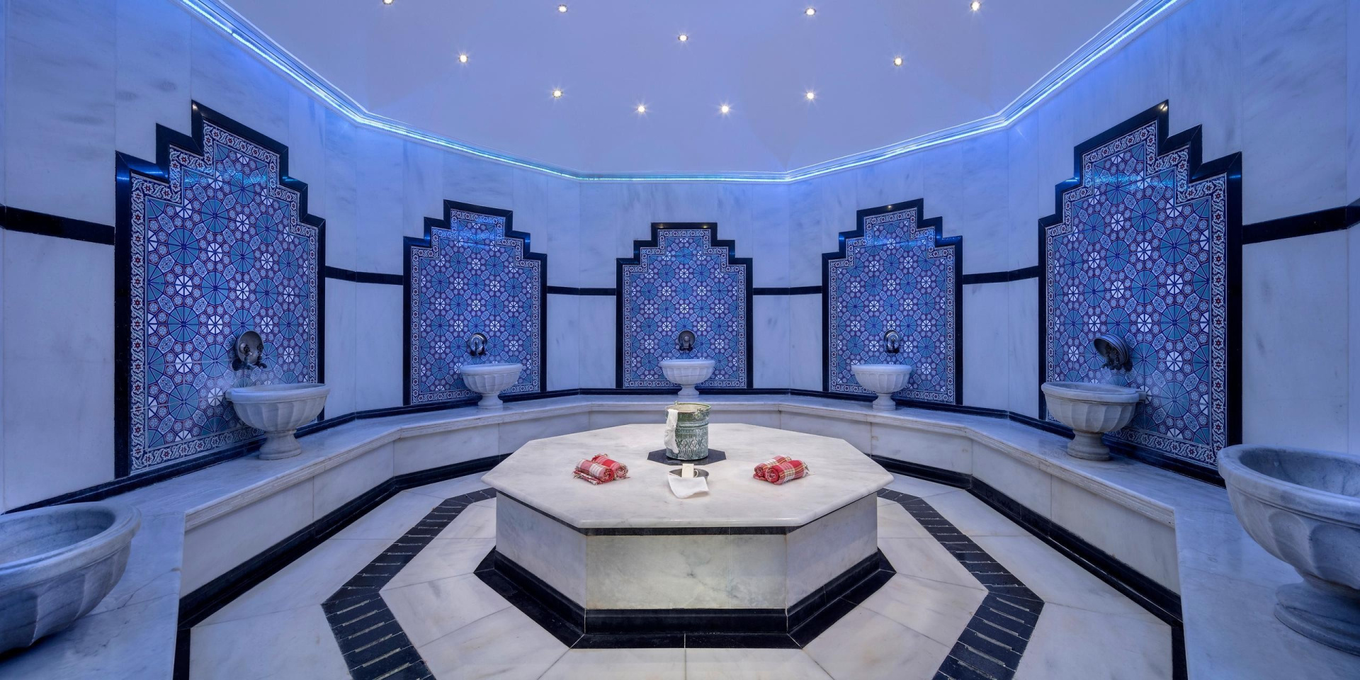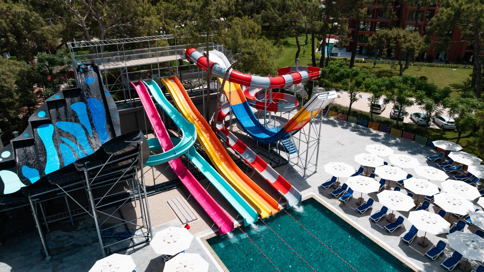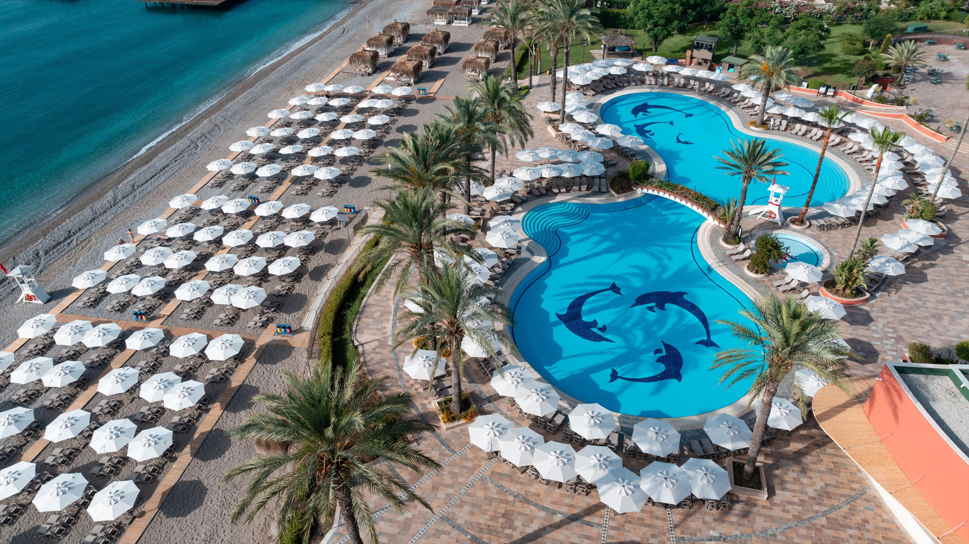 - több medence (az egyik csúszdákkal), napágyak, napernyők és törölközők ingyenesen