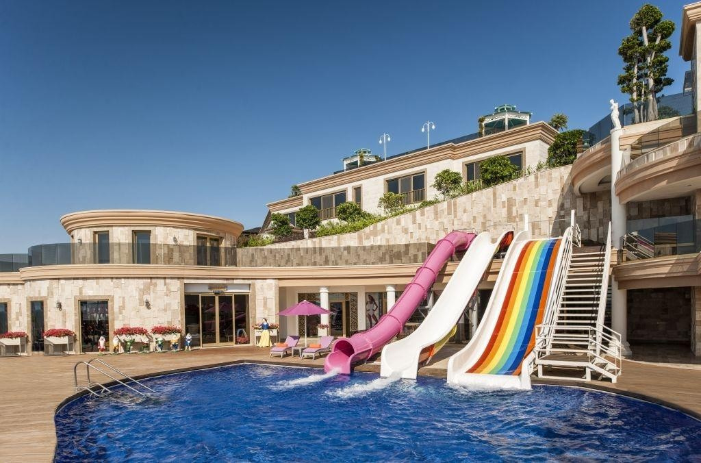 - több medence (ez egyik csúszdákkal, az egyik tengervizes), napágyak, napernyők és törölközők ingyenesen