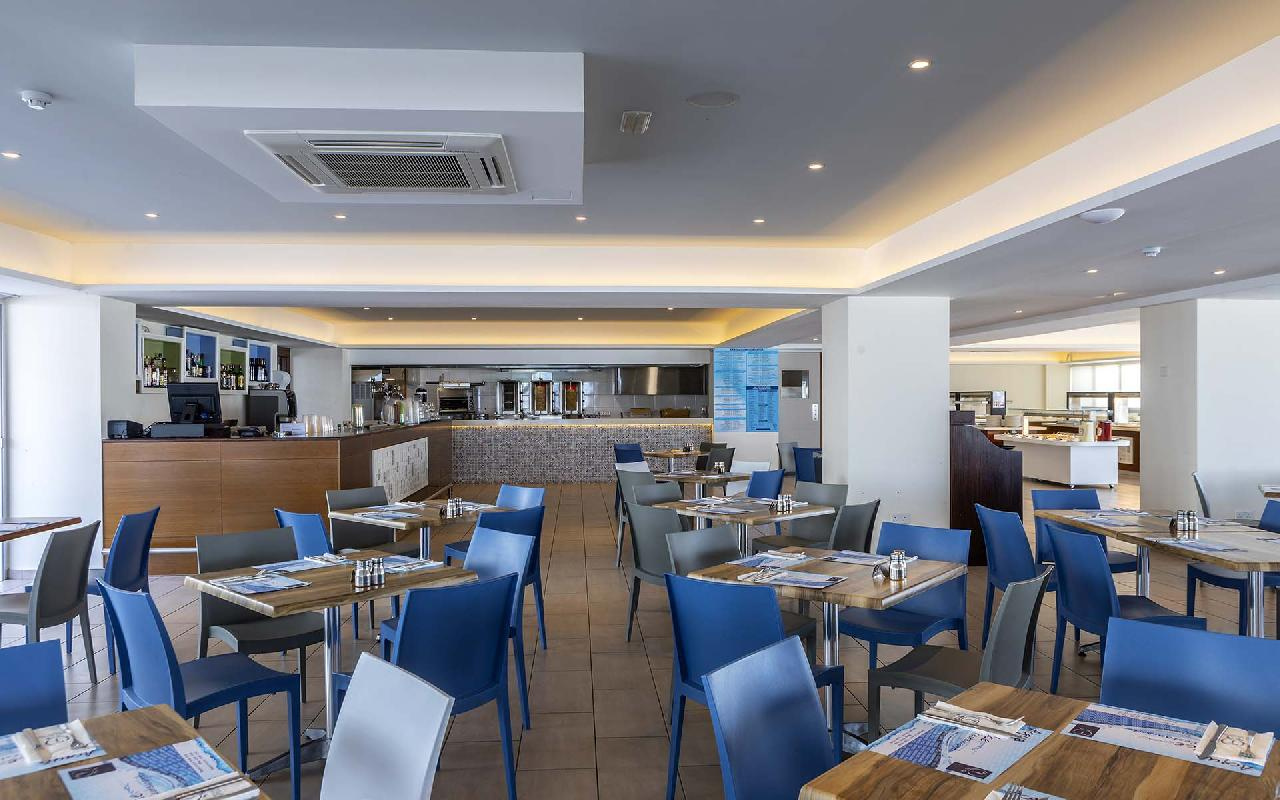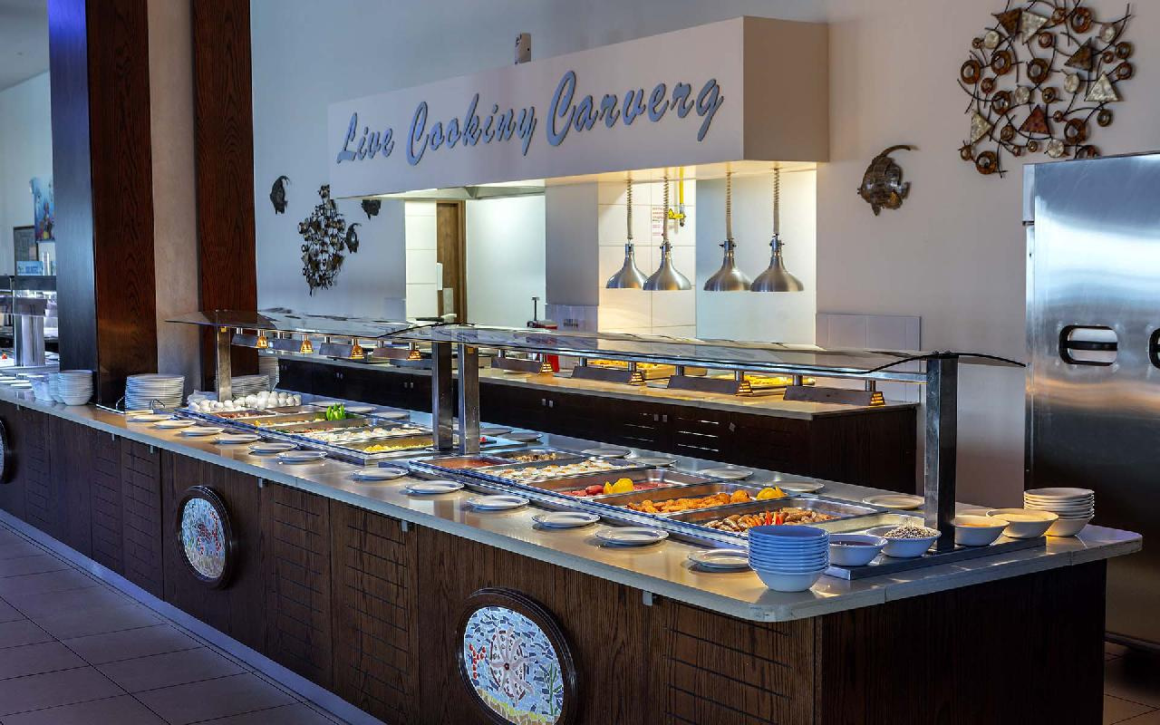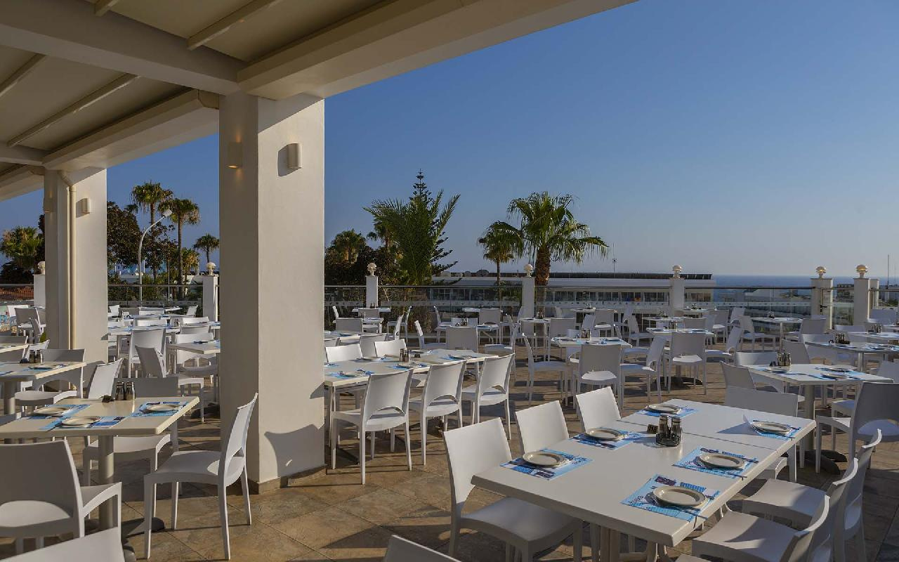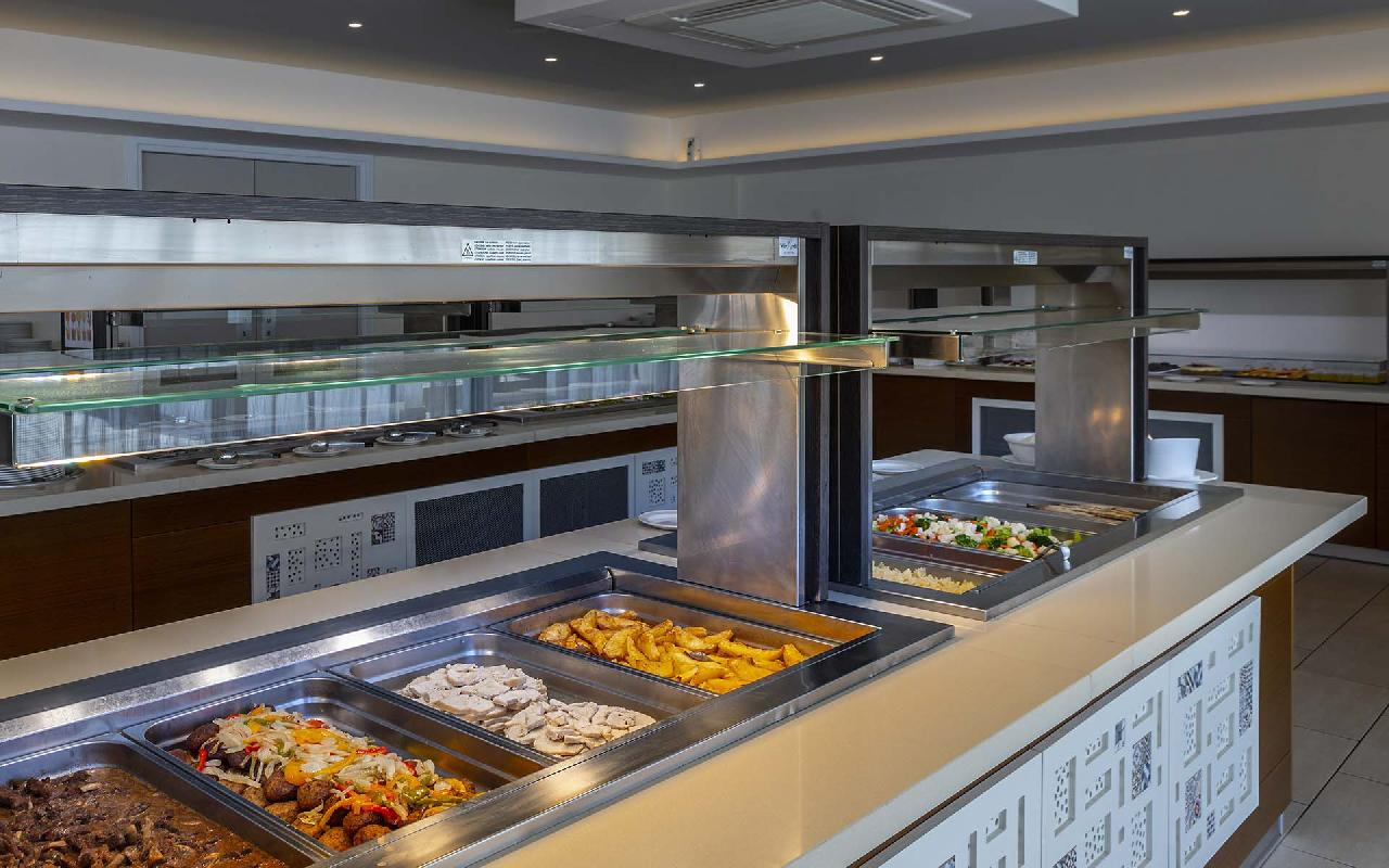 Étkezés: all inclusive ellátás, benne: büfé reggeli (07:30-10:00), ebéd (12:30-14:30) és vacsora (19:00-21:30), snack ételek és szendvicsek (11:00-12:30 és 15:00-18:00 óra között), jégkrémek, korlátlan italfogyasztás 10:00–23:30 óra között. Az italválaszték pohárban felszolgálva, a szálloda által meghatározott helyi és alkoholos és üdítőitalokra, vízre és gépi kávéra vonatkozik. Az import és palackozott italok fogyasztása térítéshez kötött. Minden este választékos tematikus büfé vacsorákkal (olasz, ciprusi, ázsiai, mexikói stb.).