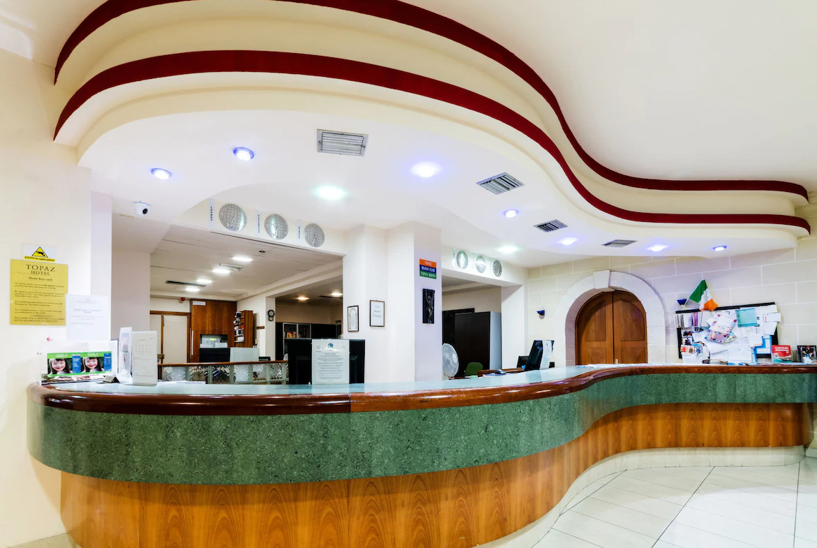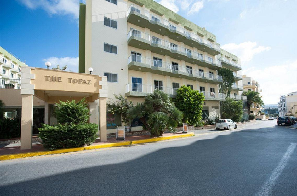 Fekvése: egy fő és két melléképületből álló, nemrégiben felújított kettőszázötvenegy szobás Topaz Hotel, Bugibba üdülőközpontjának szívében, de mégis egy csendesebb utcában, a sziklás tengerparttól tíz perc sétányira található. (kb. hétszáz méter). A tengerparti sétány mellett éttermek, szórakozóhelyek, bárok és üzletek sokasága található. A szálloda közelében található buszmegállóból egyénileg is megközelíthetjük a sziget bármely pontját.