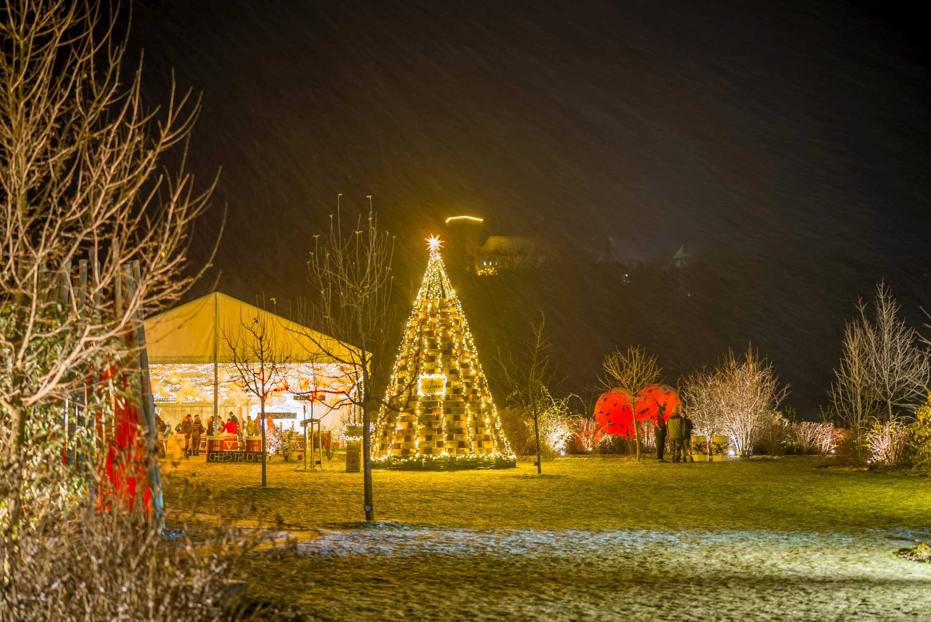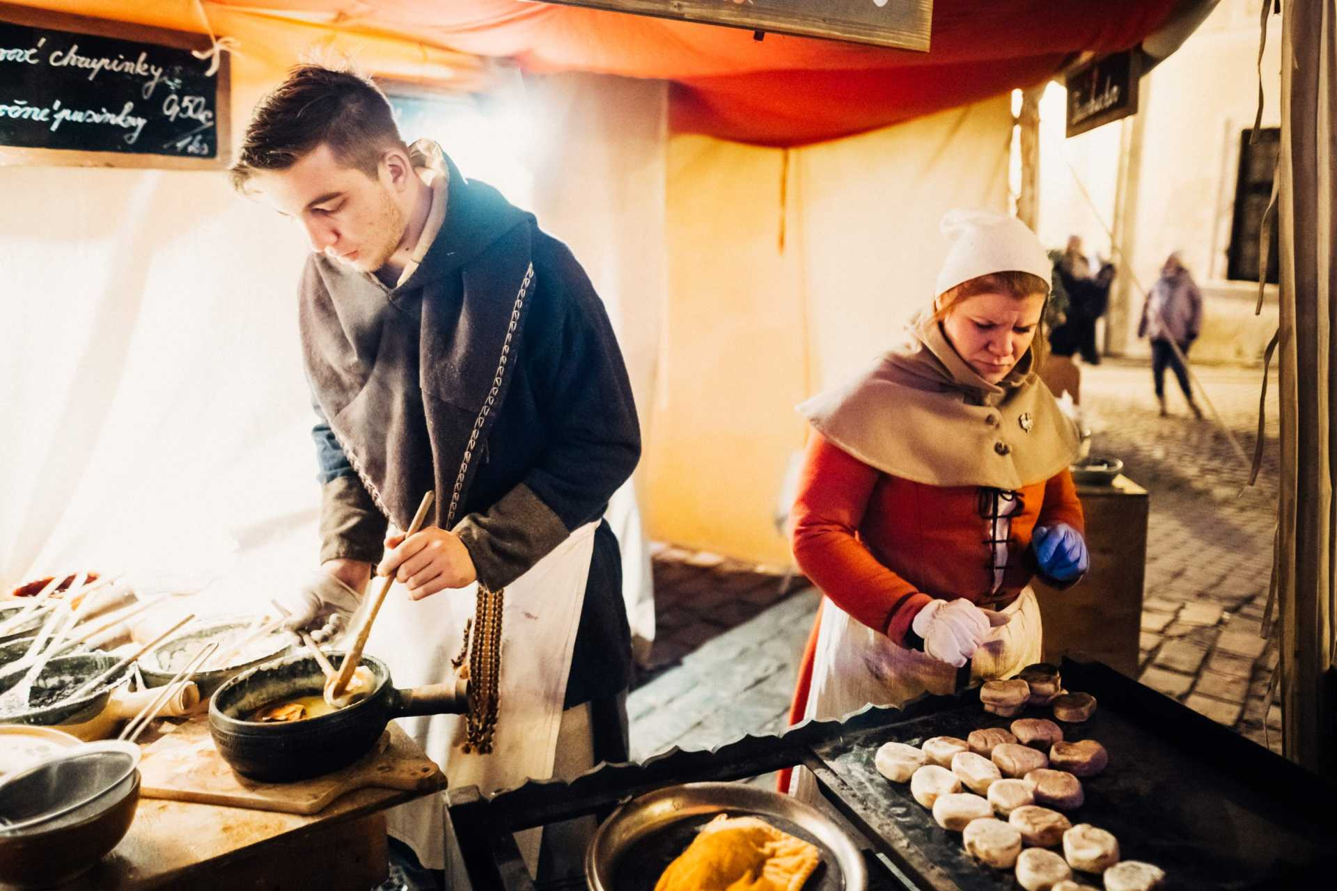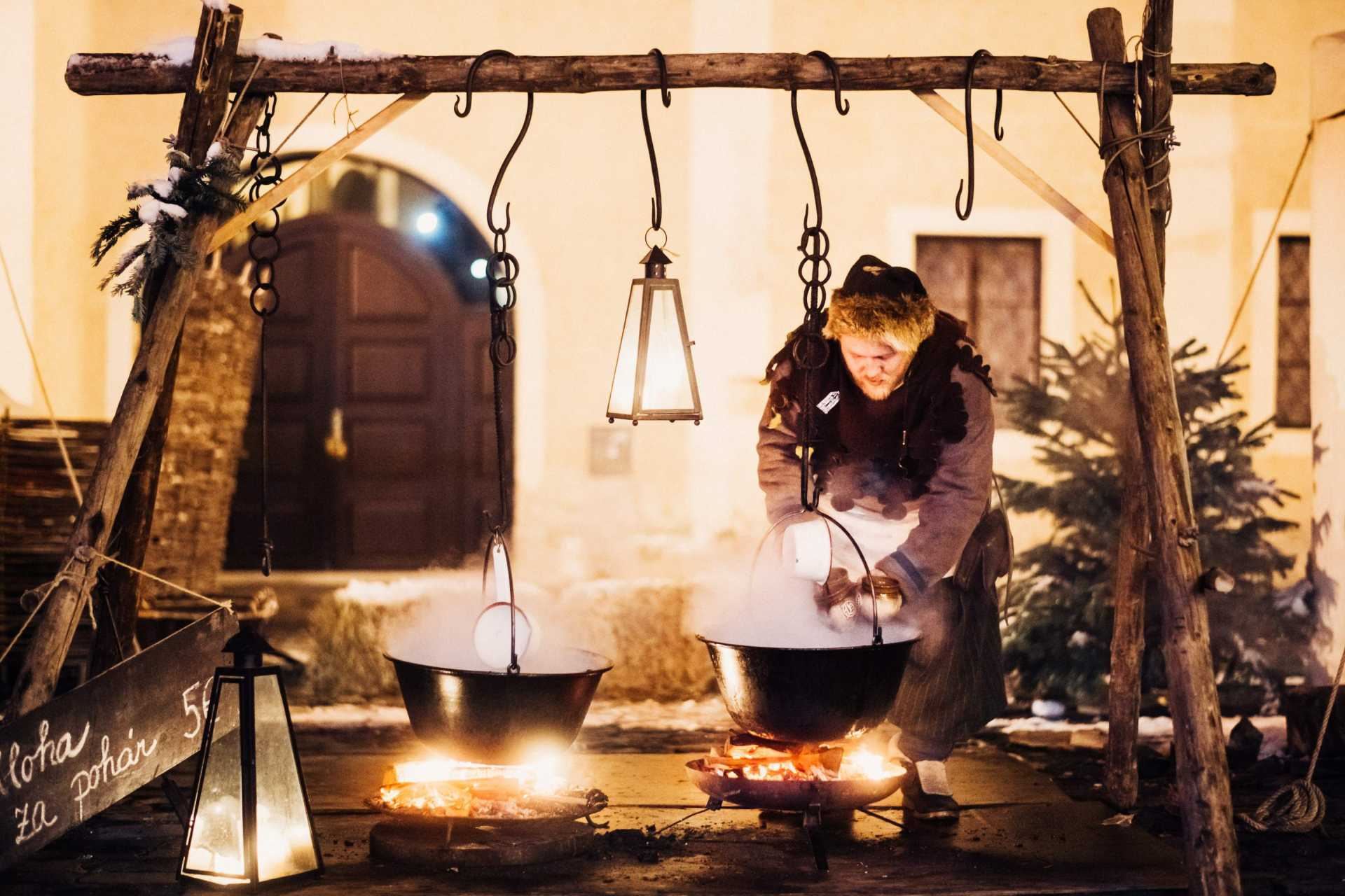 A középkori adventi vásár varázslatos hangulattal idézi meg a régi karácsonyi tradíciókat: korhű kézműves műhelyek, gyertyakészítők, kovácsműhely és közvetlenül a tűz felett főzött puncs, élő állatok (például bárányok és libák) friss hóval borított karámban – mindez mesebeli fényben és jelmezes előadások kíséretében zajlik.