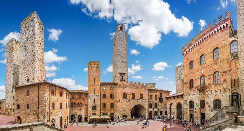 Ciprusokkal körülölelt domboldalak festői vidékén keresztül látogatunk el Siena városába, melynek belvárosát az UNESCO a Világörökség részévé nyilvánította. Városnézés a jellegzetes középkori városkában, amely a középkori kereskedők és bankok "mekkája" volt egykor. Ismerkedés a város legfontosabb látnivalóival (Dóm, Palazzo Pubblico, Il Campo, Torre del Mangia, Fontana Gaia). Látogatást teszünk San Gimignano-ban, a "tornyok világhírű városában". A dombtetőre épült "középkori Manhattan" képe már távolról kiemelkedik a toszkán táj lankái közül jellegzetes tornyainak köszönhetően, melyekből 14 maradt meg teljes pompájában. Vásárolhatunk a Chianti-ból és Vernaccia-ból, a helyi jellegzetes borokból vagy a szarvasgombával töltött vaddisznószalámiból is. Rövid séta a Toszkána szívében megbújó, etruszk alapítású Volterra középkori hangulatot árasztó belvárosában. Az "alabástrom városának" központja Itália egyik legszebb középkori tere, a Piazza del Priori. Visszaérkezés a szálláshelyre az esti órákban.